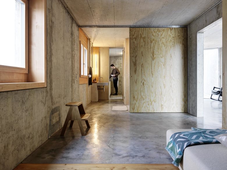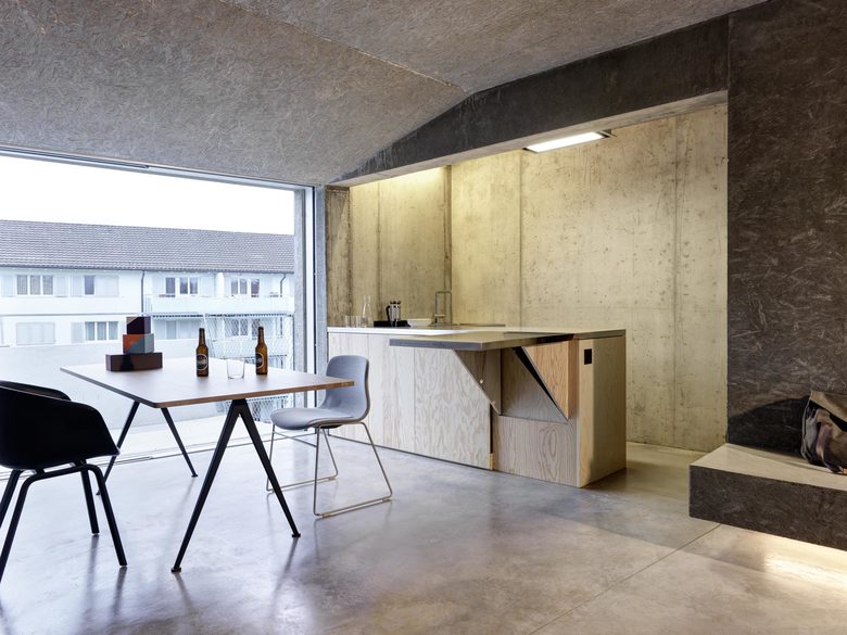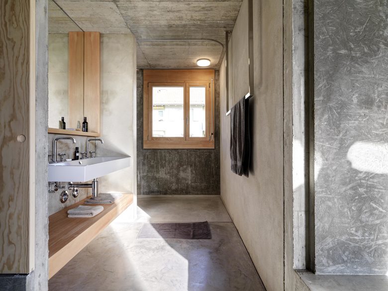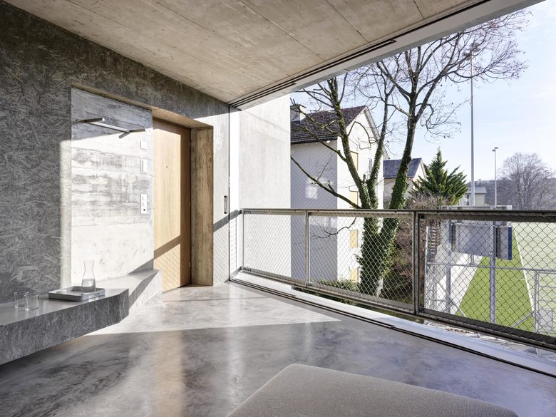 Economically optimized interventions by reducing all the technical installations of the building to a minimum – in swiss standards – we focus on a couple of interventions that add major value to the quality of the living space. These are sliding windows and a built-in bench as the communicative element of the concrete topography.