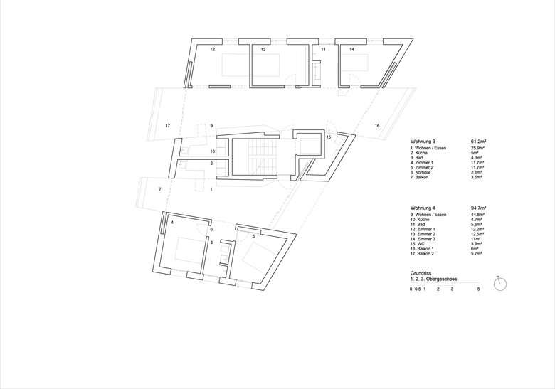 In architecture, here in housing construction, we show with this project - how the shift of the focus, away from connotations and standards - to space, momentum and room quality, makes this possible. These are four two-bedroom apartments of 60m2 and five three-bedroom apartments of 95m2 each.