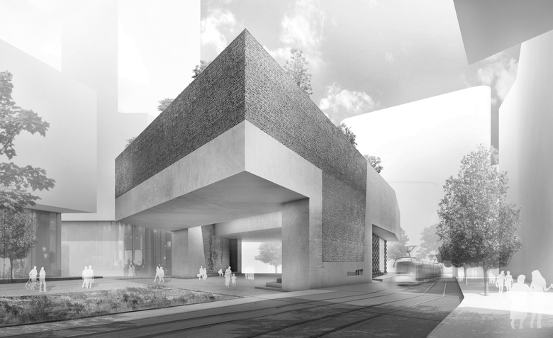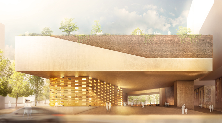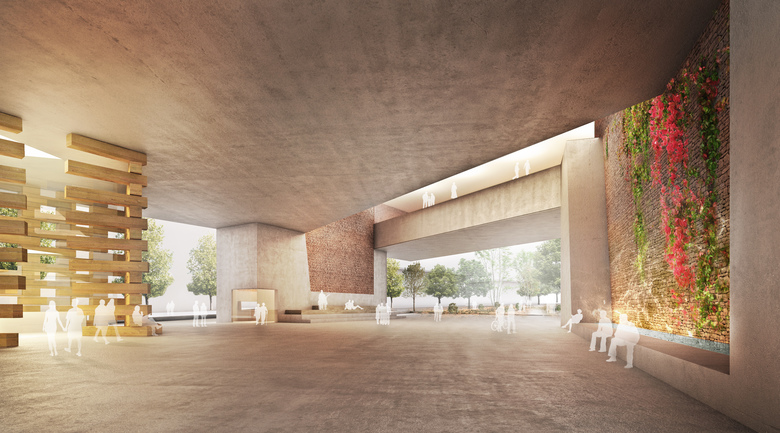 Green Park Library, Plaza and Dreamtime Park – As the public space in the new library is the new reading room, we use raw materials as a source of information. people can touch and experience the roots of their culture, raw stones, raw wood and vegetation. a sharp precise structure of concrete is the technological footprint of the library, which holds up the traditional layers of stone and embodies raw wooden blocks of roots and origin of nature and culture.
