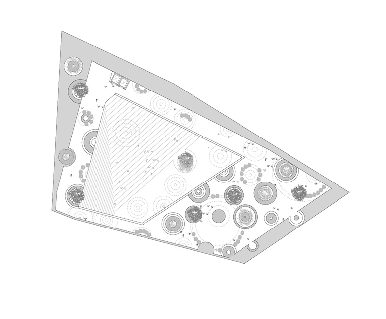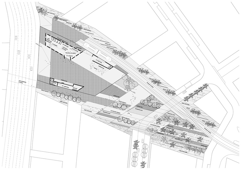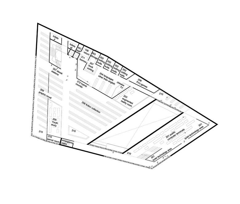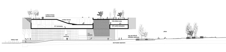 Plaza – The plaza resolves the urban knot and connects the library with the urban context, both visual and functional. It is an overlay of two cultures, there is clear diversification of various areas. The borders of the park are the conceived as dreamtime areas, the natural park. The central part anchors itself into the urbanism of its surroundings, the urban park. On the far end of the park the library is located.