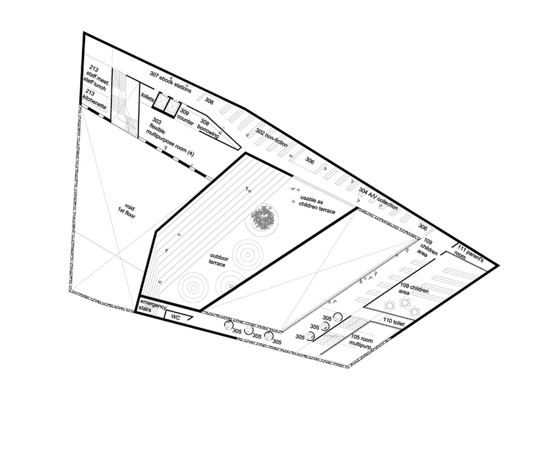 Library – The ground floor of the library is a covered plaza, a public reading room. This public area is related to as the “real world”. The program of the library is elevated above and around this plaza, providing shelter for sun and rain. The building’s roof is the “dreamtime world”. This rooftop garden is only accessible during the opening hours of the library. It serves as a panoramic terrace with views to the city,