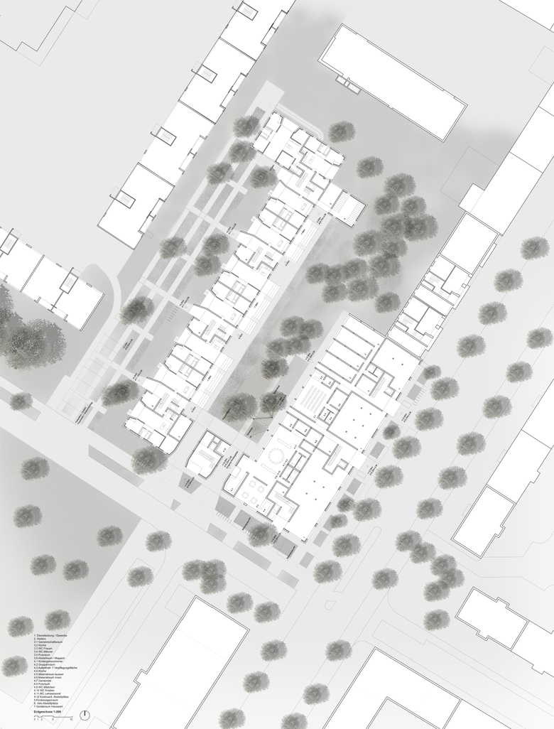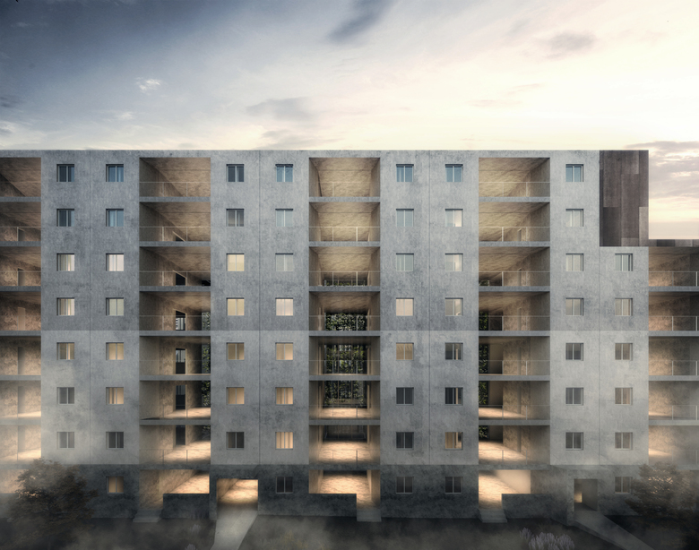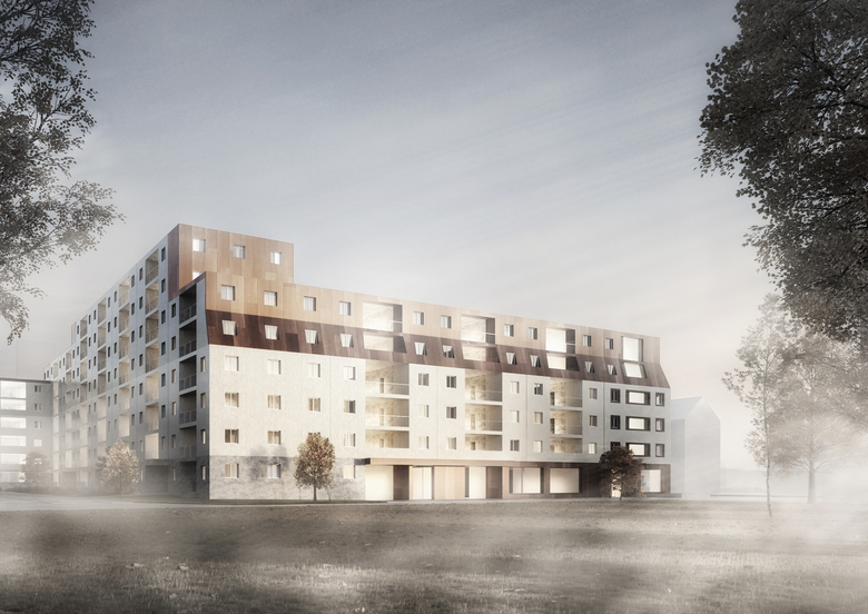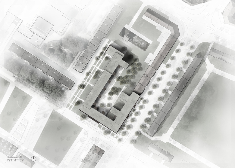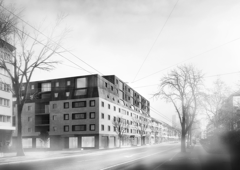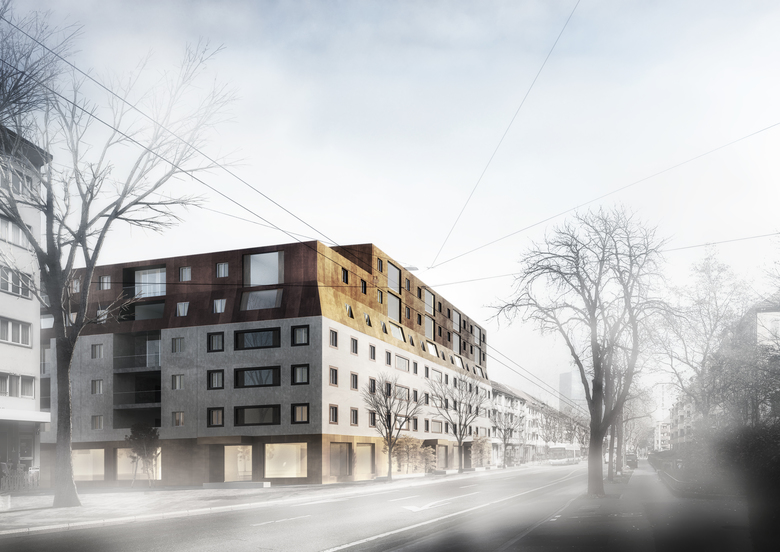 Die neue Wohnsiedlung Hardau I ist typologisch eine Weiterführung der Block¬randüberbauung der Hardstrasse. Sie schliesst die strassenseitige Gebäude¬front und generiert rückwärtig zwei neue Gartenräume. Es entsteht ein intimer Innenhof mit Wald und ein zweiter Grünraum, als Erschliessungshof im Dialog mit der Siedlung Hardau II. Diese Höfe sind von den Lärmemissionen der Hard¬strasse geschützt und bilden Erholungszonen mit hoher Aufenthaltsqualität. An der Hardstrasse sind im Erdgeschoss publikumsorientierte öffentliche Nutzungen wie Läden, Bäckerei oder Ateliers vorgesehen. Der Baukörper folgt an der Hard-strasse der vorherrschenden Bauflucht und ist quartiertypisch als repräsentative Strassenfassade mit einem ausgeprägtem und mit Kupfer ausgekleideten Sock¬elgeschoss geplant. Insgesamt sind es vier Vollgeschosse an der Hardstrasse, mit einem markanten Traufbereich, der die bestehende Strassenflucht aufnimmt und akzentuiert. Die Vollgeschosse 5-7 der Strassenfassade werden typologisch als Dach formuliert. Dies wird über die Materialisierung, die Dachfassade ist mit Kupfer verkleidet und über das schräg akzentuierte Volumens im 5. Vollgeschoss erreicht. Das 6. Und 7. Vollgeschoss gehen vertikal als Dachvolumen weiter. Diese typologische Analogie an der Hardstrasse steht im Dialog mit dem hetero¬gen Quartierscharakter und dem unmittelbaren historisch gewachsenen Umfeld. Das repräsentative Sockelgeschoss mit Kupferverkleidung zieht sich um die Ecke bis in den Hardau Park und endet mit dem Kindergarten und dem Durchgang zum Hof. Die rückwärtigen Fassaden zu den Höfen sind einfacher gestaltet, durchwegs als Kompaktfassade, mit einem hellen Ocker Farbton.