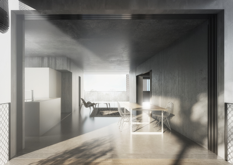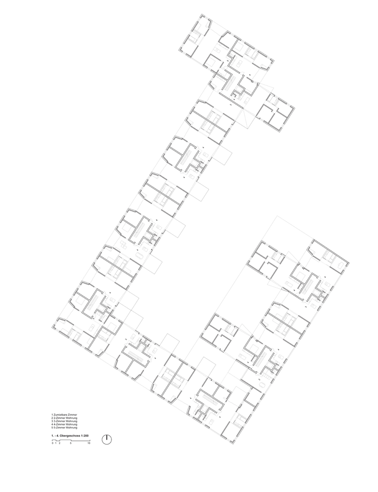 Der ganze Baukörper ist auf einem Modul von Wohnungen von jeweils 11.40m x 11.40m aufgebaut. Die kompakte Fassade und Anordnung der Bäder und Küchen erlauben eine wirtschaftliche Ausführung der Baute. Die Wohnräume sind als durchgehende Räume geplant, meistens von Südosten nach Nordwesten, von der Morgensonne zur Abendsonne. Im nordöstlichen Teil ist eine Loggia und im südöstlichen Teil ein mit Pflanzen bewachsener Balkon zum Gartenhof vorgelagert. Die Wohnung kann zu beiden Aussenräumen mit Schiebefenstern ganz geöffnet werden, womit sich der Wohnraum über die warme Jahreszeit bedeutend vergrös-sert – Morphologisch wird die Wohnung ein überdeckter Aussenraum. Wirtschaftli¬chkeit wird über ein einfaches Konstruktionskonzept erreicht: