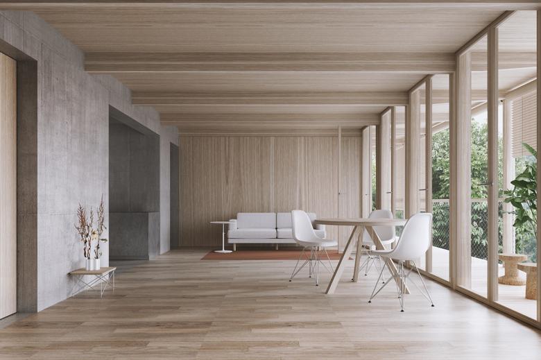 Die Decken spannen einachsig von der tragenden Wohnungstrennwand zur Außenwand. Sie werden aus Brettsperrholzelementen hergestellt und bleiben holzsichtig, so dass die Konstruktion im Raum erlebbar ist.