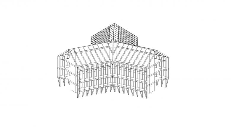 Im inneren Erschließungskern befinden sich die Treppenhäuser, die Auszugschächte, alle Bäder und Küchen. Dieser Kern wird aus Stahlbeton als Sichtbeton Schalungstyp 2 errichtet und dient der Gebäudeaussteifung. Die sternförmig abliegenden Wohnbereiche werden konsequent in einer reinen Holzbauweise errichtet.