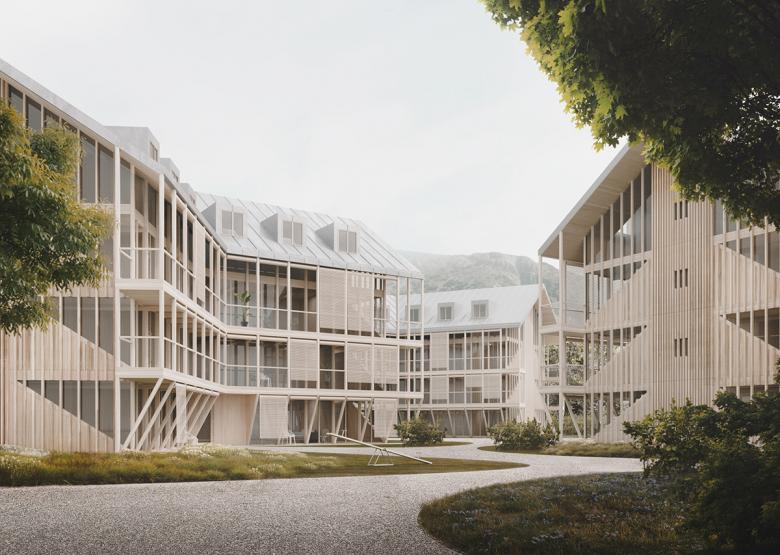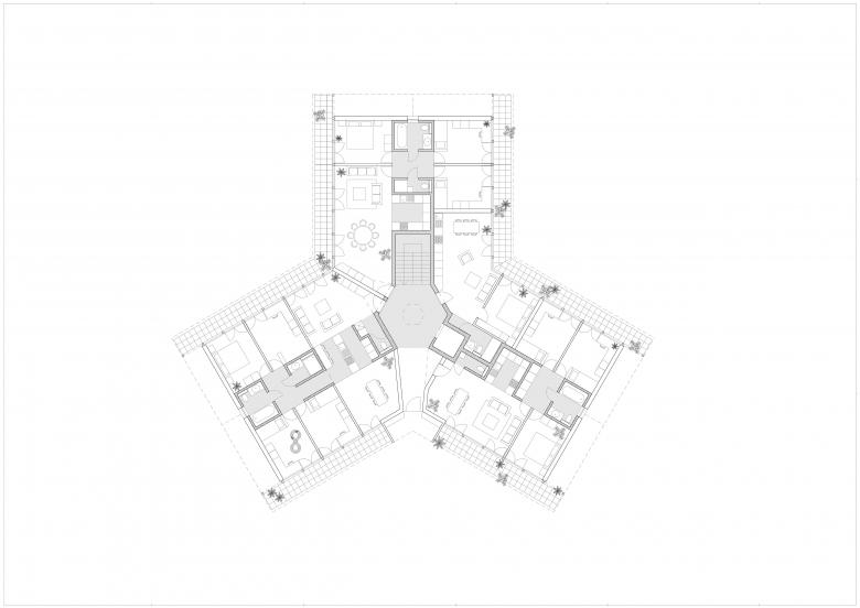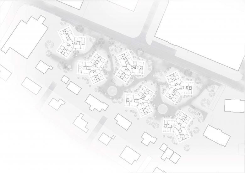 Die Setzung von sechs sternförmigen, freistehenden und als Gruppe in Erscheinung tretenden Baukörper mit Ihren 3 Flügeln und deren Fluchten, schaffen differenzierte und öffentliche Hofbereiche. Veranden im Erdgeschoss sind mit halbhoher Buschiger Begrünung vom sonst halb öffentlichen Grünraum gefiltert. So wird eine Durchwegung ermöglicht und ein Ort der Begegnung und Kommunikation geschaffen.