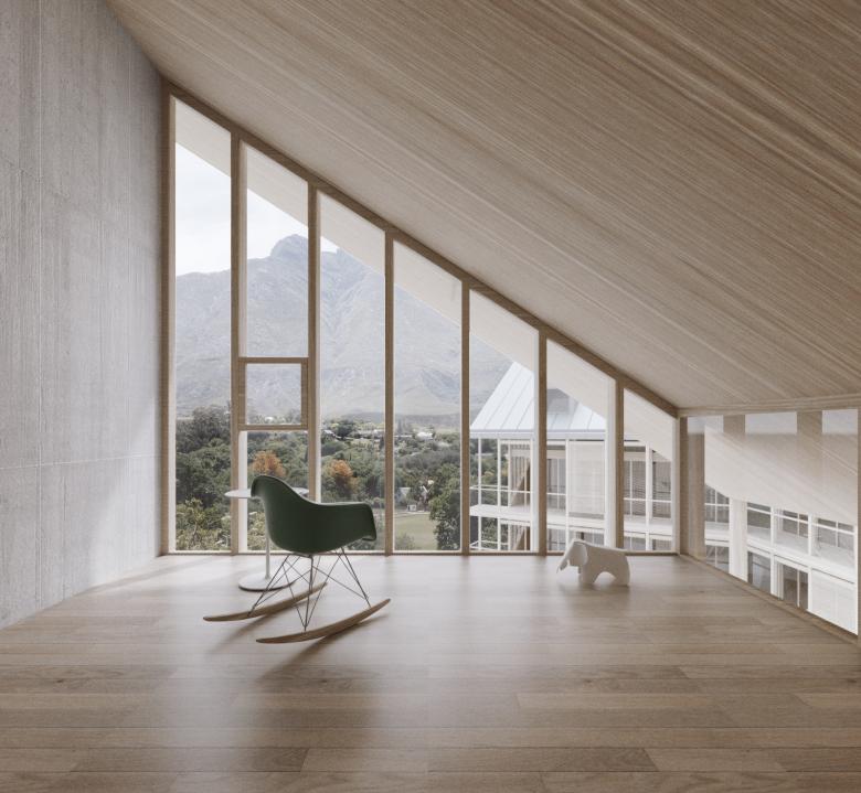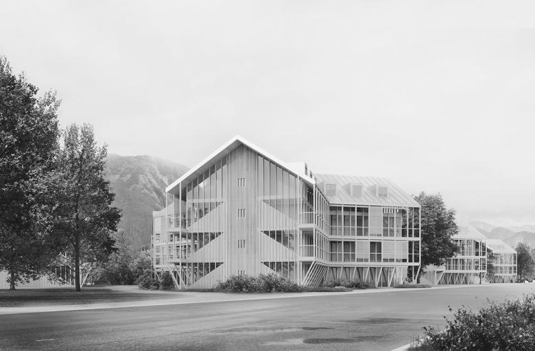 Eine Struktur aus Holz umgibt den Kern, der alle Installationen wie Treppenhaus, Lift, Nassräume und Küchen aufnimmt. Damit sind alle Wohn und Schlafräume in der Holzstruktur und erweitern sich über die Holzterrassen bis in den Gartenraum. Dieses Räumliche Holzfachwerk, beinhaltet Terrassen und ist auch als kommunikative Fassade der Häuser zueinander im neuen Quartier zu verstehen. Da die Betonkerne alles notwendigen statischen Aussteifungen übernehmen, können auch die Kniestöcke aus Glas ausgeführt werden.