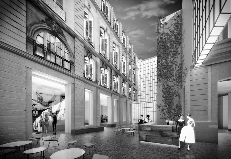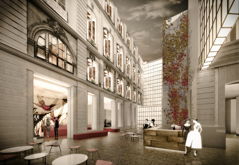 All the rooms are facing the passage with doors and windows (restaurant, bar, reception, library, hallways). They are the atmospheric content, they tell the story of Paris, full of life and passion. Like a writer or painter that strolls through the lively Paris old town and sees and hears all the colours and noises coming from the houses. Seduction: what is going on inside?