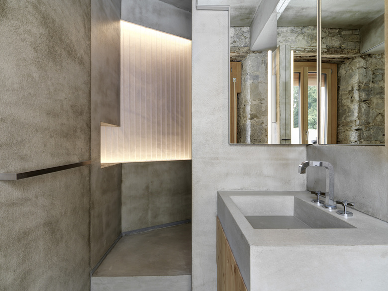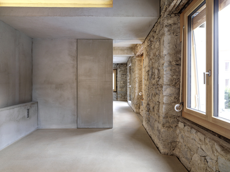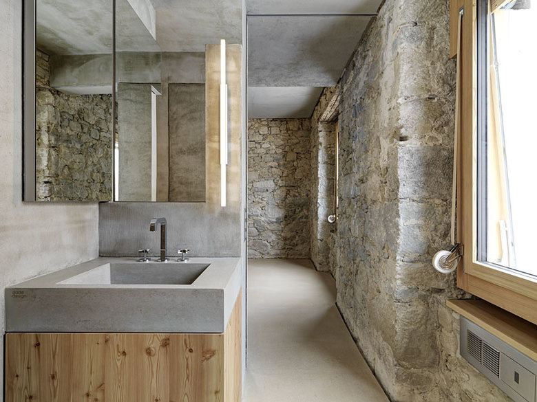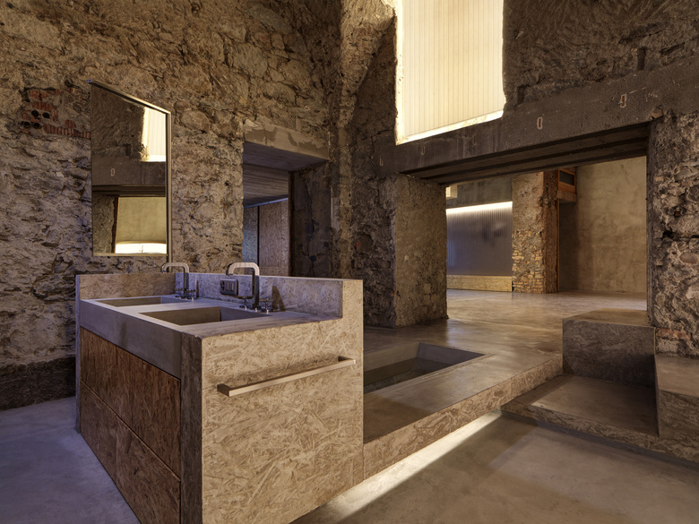 Raw Is Finished - We have natural stone walls of one meter width, concrete furniture and wooden windows with a 20 cm thick solid frame. The dialogue on the historical context consists in the reference of the 'work', how and by whom was it made - at that time large stone blocks were stacked together - today, topographies were formed from reinforced concrete.