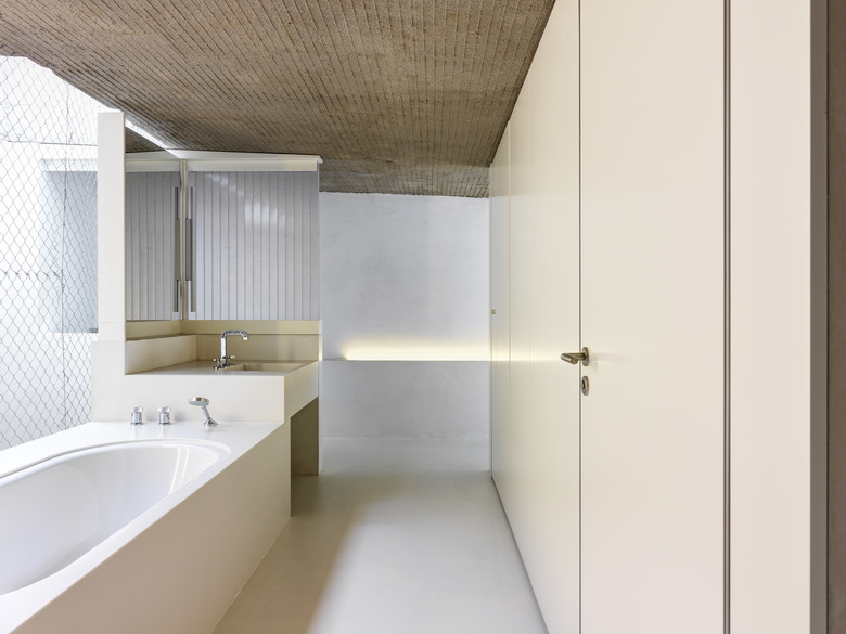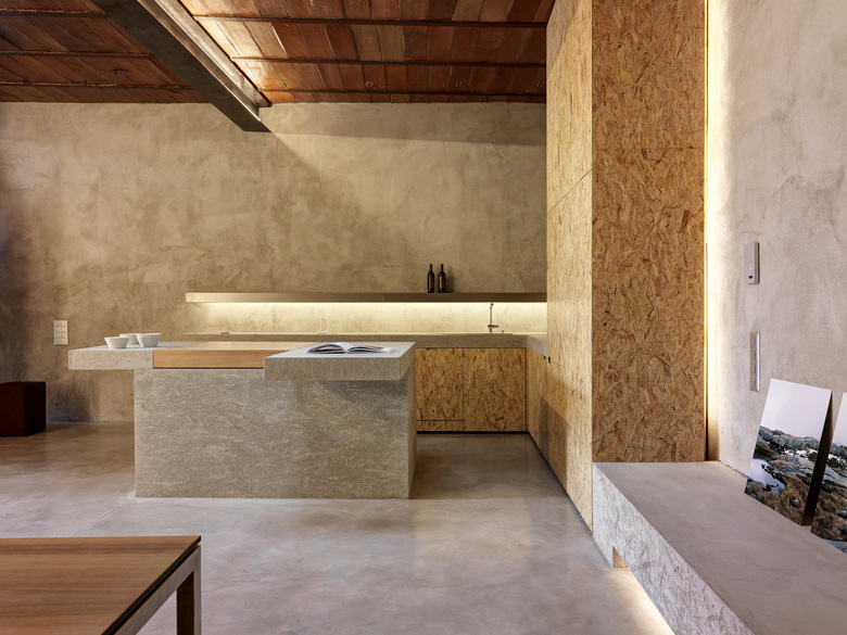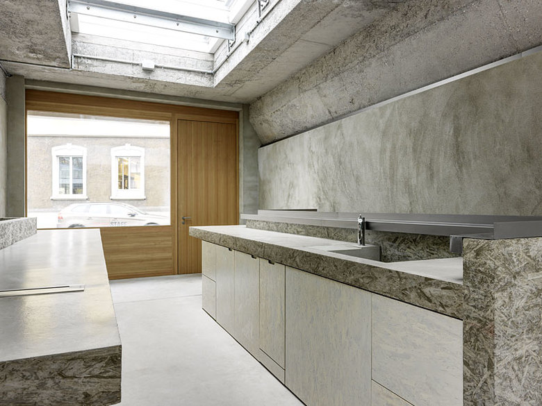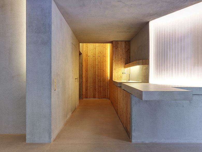 The built in light weight strucures are plastered with basic plaster - and have a rocky appearance. The built-in furniture is made of raw concrete, raw wood and raw plaster.