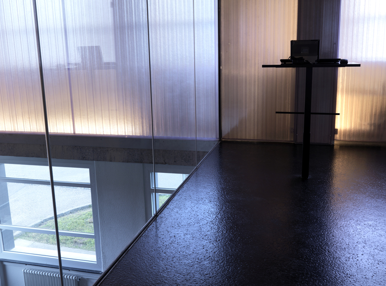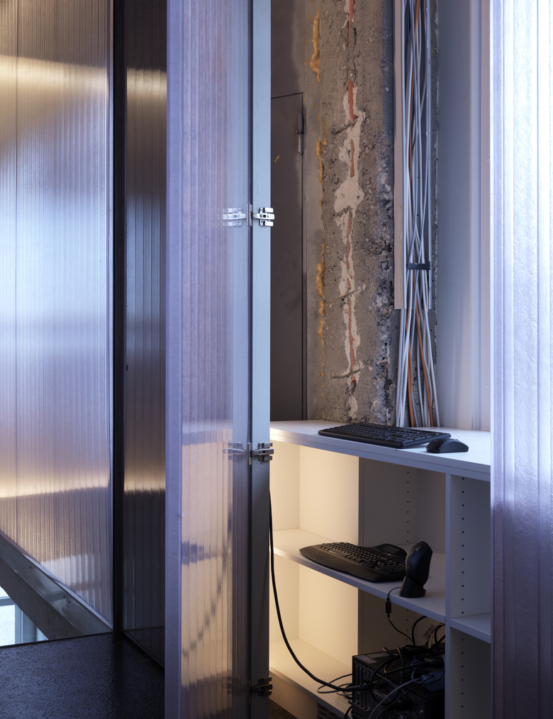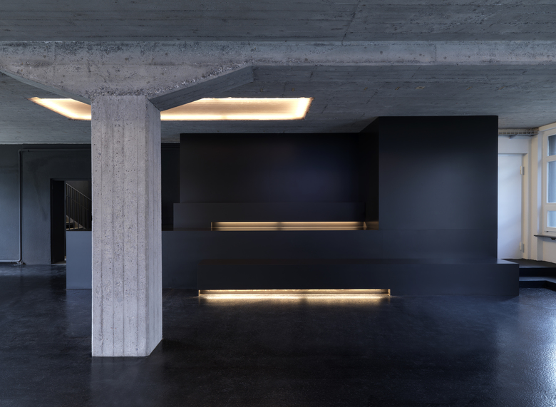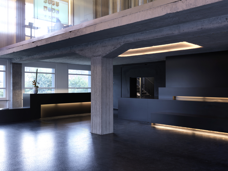 We created the high tech media lab with all the latest technologies in a very rigid old factory space. We cut a huge slab out of the concrete ceiling to get a high entrance hall with the meeting room on its gallery. The act of cutting the concrete and let it be visible stands for the ancient times of physical presence, which we call anarchy. Around the upper part of this space we set a very fine and precise light façade, actually a light space, floating above and in between all this old concrete.