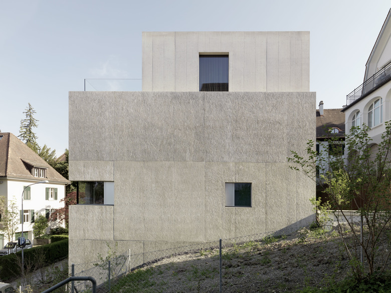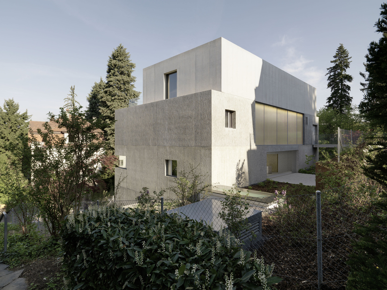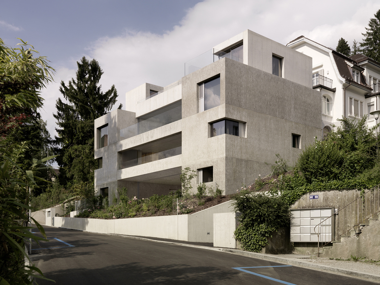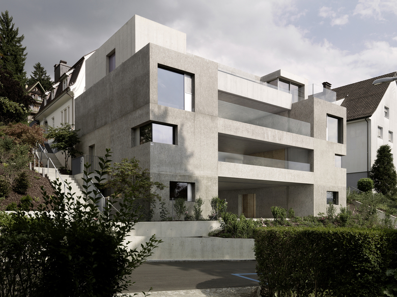 Program and context – The site is located in the district 6 in the city of Zurich, originally a residential neighborhood with large gardens. The project was an apartment building with three rental apartments, one apartment on the ground floor with a garden, an apartment in the middle, due to the slope with a garden too and on the top floor a duplex penthouse. The wanted the living rooms to be outside rooms with maximum views and optimal exposure to receive the light. This while keeping the upmost privacy in the dense Context of the city. Therefore the goal was to achieve spaces you normally only get in private houses, but not in an apartment building.