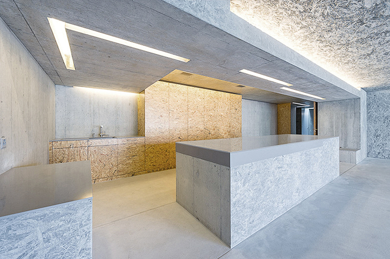 The different casted surfaces enhance the feeling that the living room is actually an outer space. In concrete recessed light fixtures provide indirect lights, enhancing the impression of mass communication in space, components become alive with light.