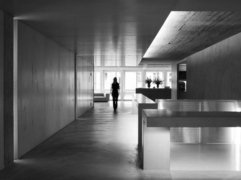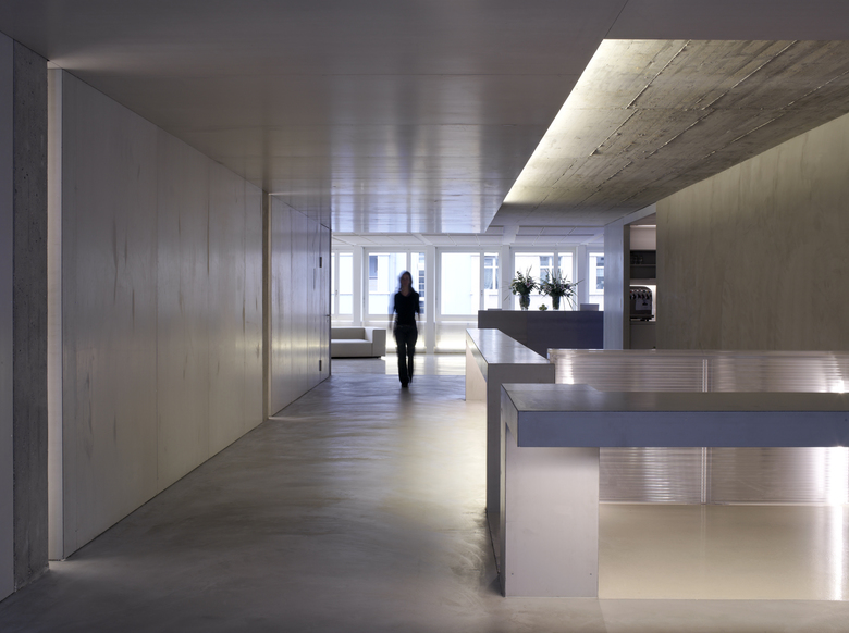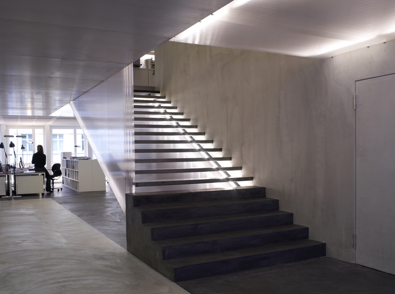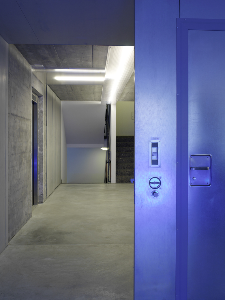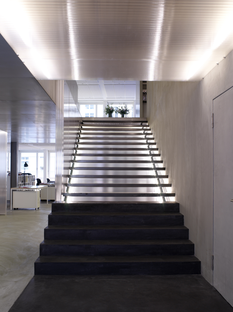 circulation (stairs and escalators), meeting rooms , office kitchens and toilets. you enter the agency by the escalator which is part of the concrete city block. so when you step out of the lift you are in the agency and not in a staircase. to make that spatially possible we set a big metal fire proof sliding door ( 3 x 3m) as the invisible separation of the old staircase and the agency.