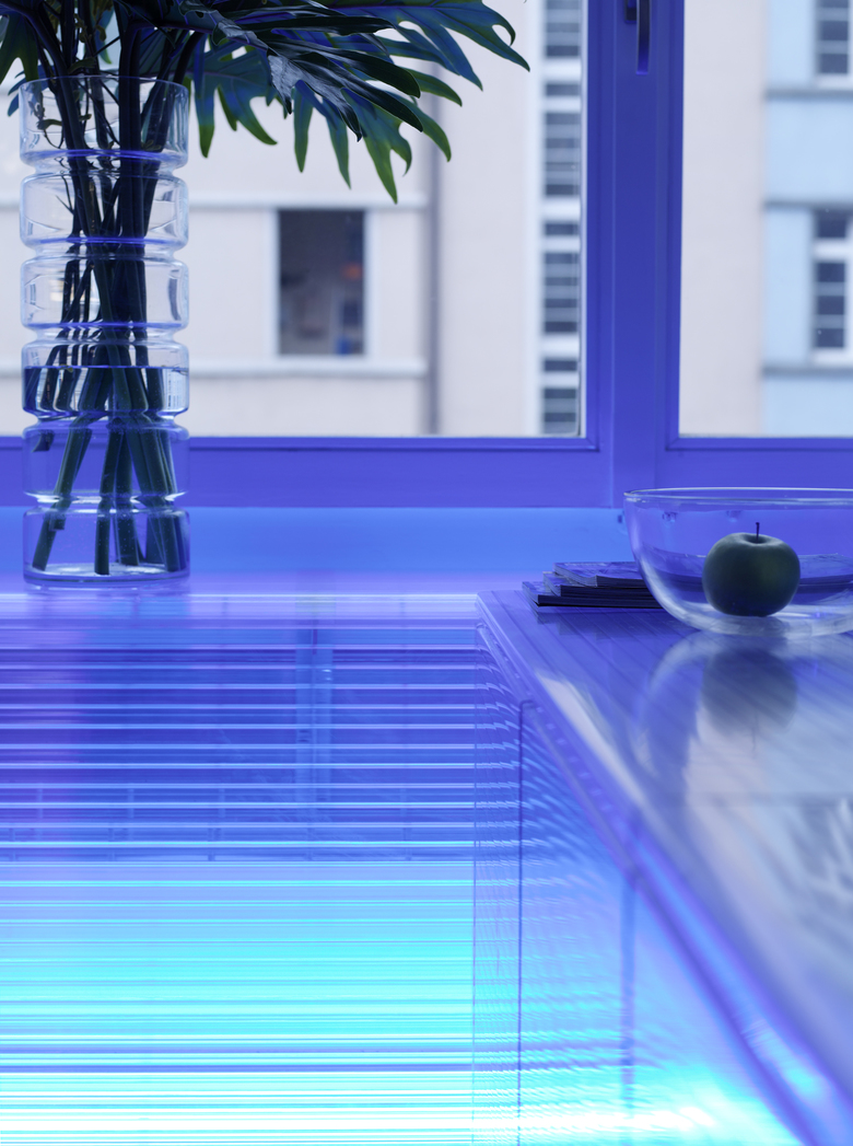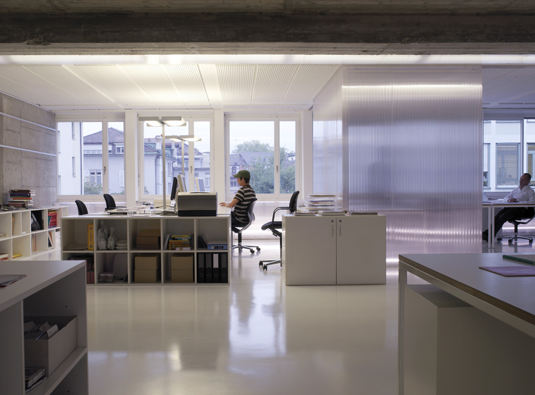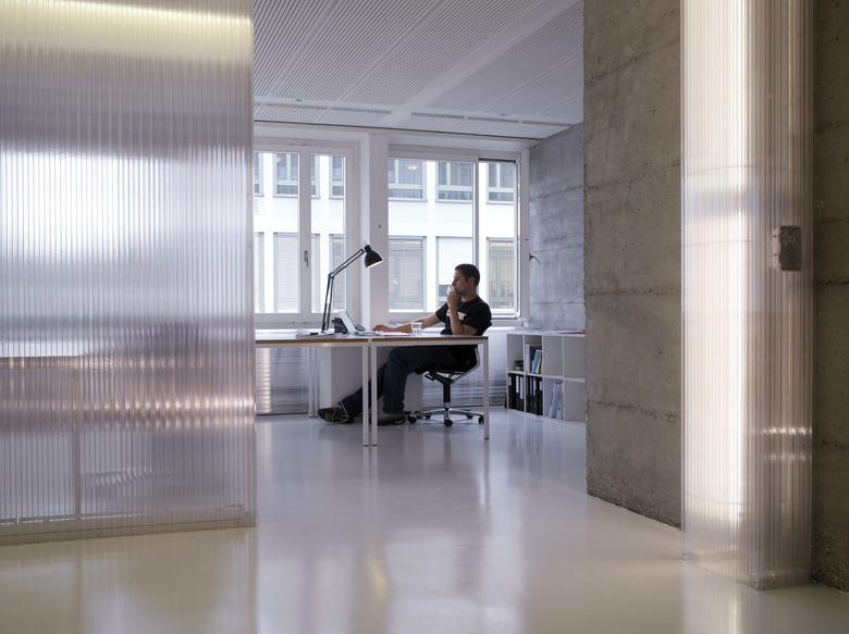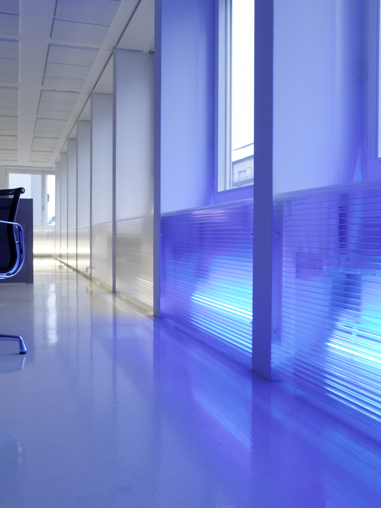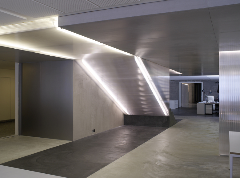 as everything is raw and visible we packed the existing installations into polycarbonate panels and put lights in them, so there are light beams playing along concrete beams and two L – shaped light walls that, once sliding open, create offices.
