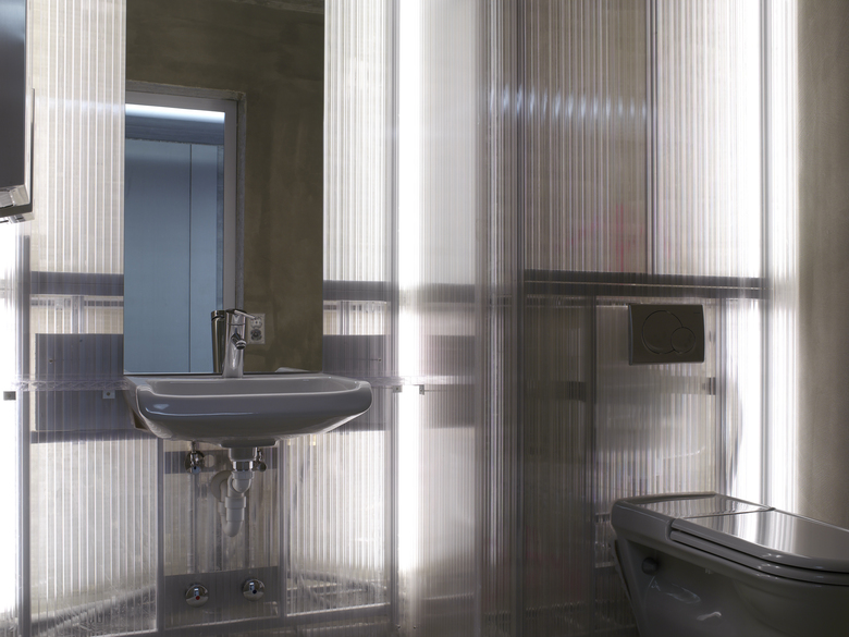 the owner of the building had his own architect who took care of the realization of the toilets. as he didn’t like our concept of space and materials he tried to boycott it by saying: the toilets are going to be real toilets like in the offices above, we will install it that way and you then can choose the last coat. no problem, we let them install the toilets, put lights alongside the installatoins and finished it with polycarbonate panels, a beautiful city facade emerged...
