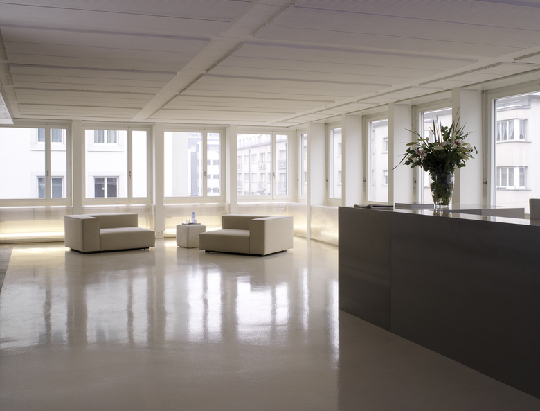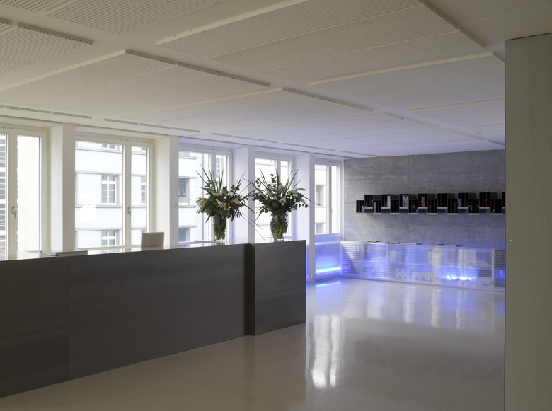 the reception and chill out area are the beach, situated at the south facade with the most amount of sunlight and views to the city of Zurich. the floor is made out of real sand, which we covered in a layer of transparent epoxy. so the surface is super slick, but you can see real sand as you walk on it, just like a beach. the radiators along side the inner facade we covered with polycarbonate and light it up to create a horizon (some blue light suggests the blue water of the sea).