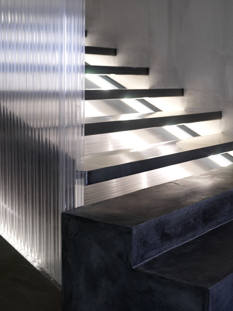 instead to design a staircase we let two areas of the city meet, the beach’s sand (sand and epoxy) is being winded down onto the street (black concrete), to dematerialize the stairs and to solve the need of a banister we packed the whole staircase in a transluscent and light up volume of polycarbonate. from downstairs it looks like a light volume of an ufo opening itself and touching the ground. above the stairs there is an opening in the ceiling of concrete panels, where you see the real old concrete, light up. it’s like a skylight and the concrete is the sky.