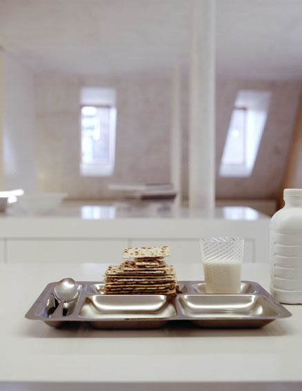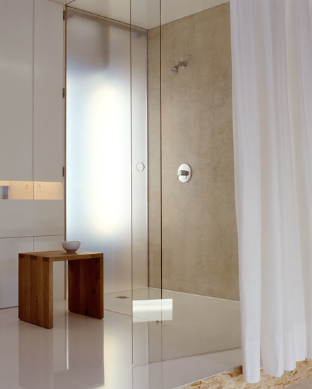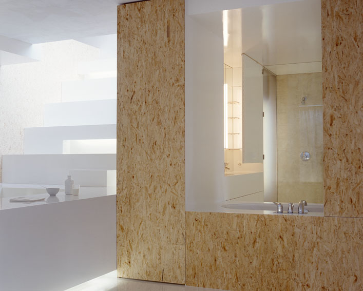 the intimacy of the bathroom depends on the chosen situation. the wall besides the bath slides open, touching and communicating (through a light gap) with another ice block (the bed and cupboard sculpture) in that situation the bath is totally exposed in the middle of the flat.