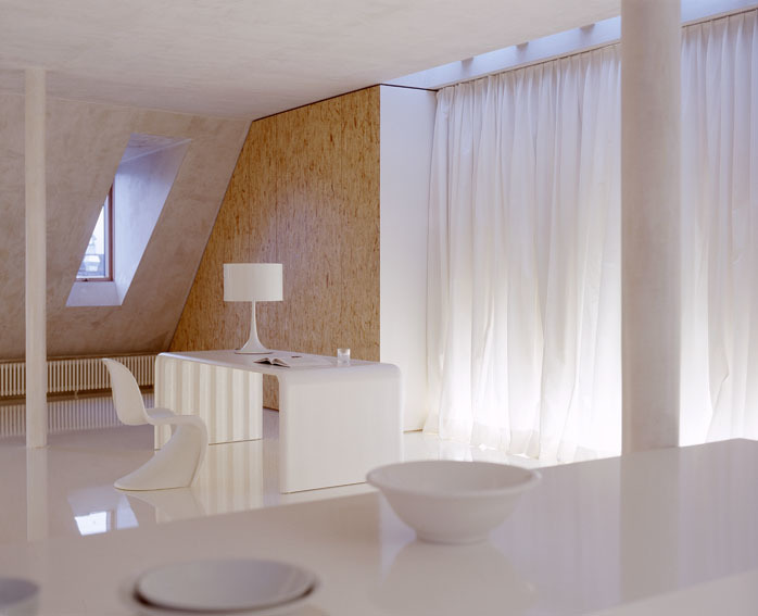 the design concept – the project was to design a new generous loft in the attic of the house at loewengraben 13 in the old town of Lucerne, Switzerland. the raw interior work was already finished. the challenge of the situation; a rather dark space, as there were only small roof windows, a skylight and a terrace with a great view on the top floor. the terrace was accessed by small stairs and the gallery floor blocked the light from entering the flat. the shape of the original space was a rectangle with the two long hard walls squashing the space.