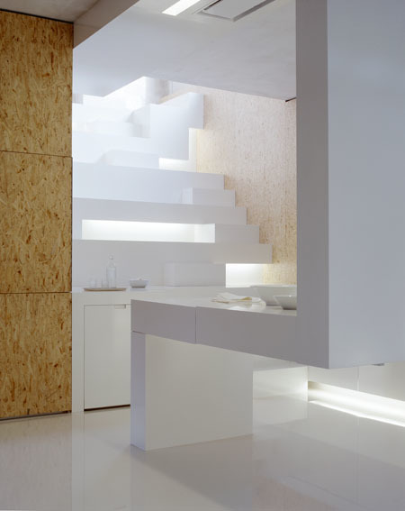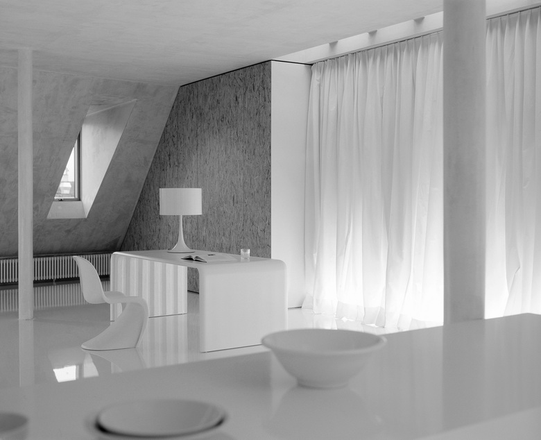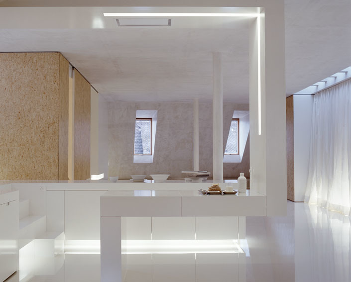to give the impression of a landscape and make the ‘glacier’ work, we let all the programs disappear. the programmatic elements of the kitchen disappear fully, partly into the glacier and partly into the rock. so no element is permanently occupied by any program, giving us the association of a kitchen, rather than a sculpture. to dissolve the tension of the other long wall we packed the existing skylight into a cubic opening (the other rock) and let the wall disappear by suggesting an opening; a huge light up textile curtain. behind that curtain the entrance, the wardrobe and even paintings can be hidden or exposed.