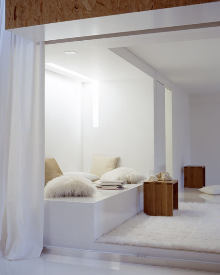 while opening the bath, the space in the bedroom becomes more intimate up to half the body height, providing enough intimacy for changing. a curtain finally enables to visually totally block the bath and shower area (a cubic opening in the rock).