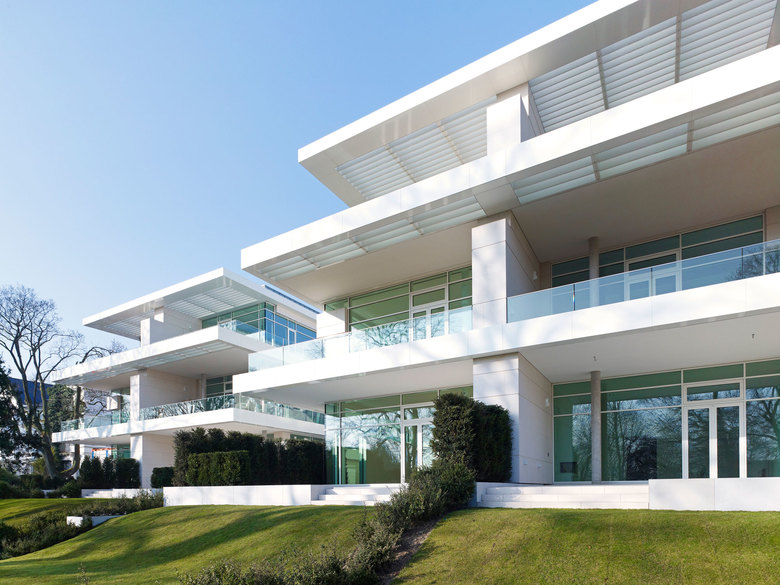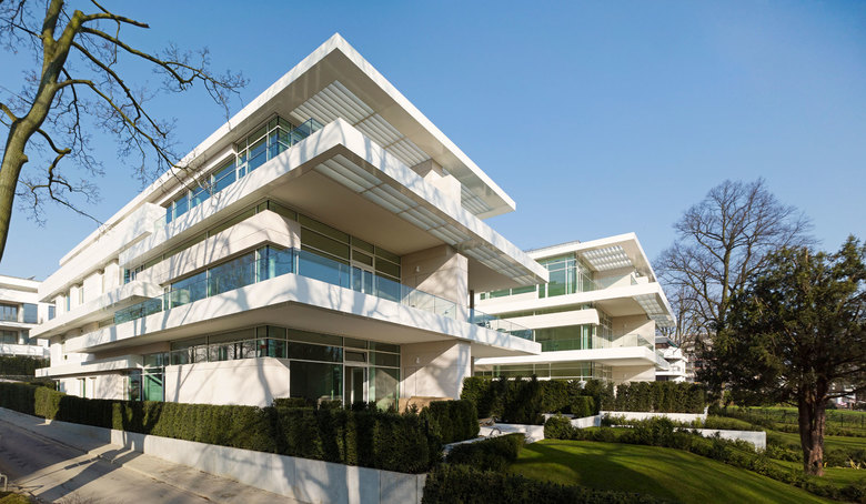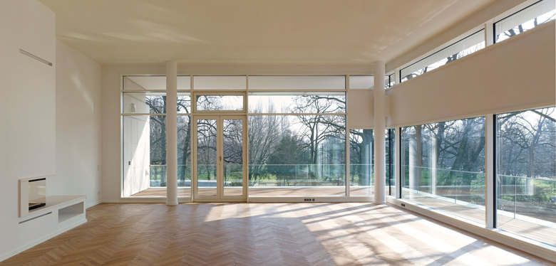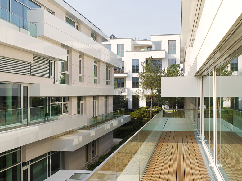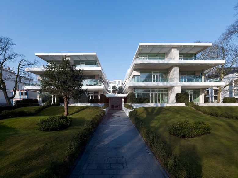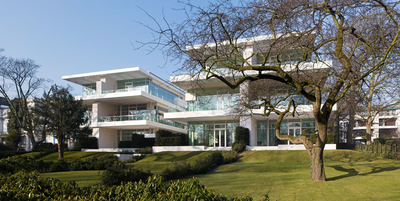 Harvestehuder Weg 25, a lakeside property in Hamburg, offers a grand opportunity to create exclusive residential space due to the unique location in the immediate vicinity of the outer Alster Lake. The goal of the draft was to gingerly fit the new building ensemble into the surrounding housing environment while simultaneously making the most of the qualities offered by the sloping site for all the apartments being built. Borrowing from the existing urban development structure on this street dotted with mansions, consulates and historic homes, two individual villas are situated directly lakeside, to the rear a block of apartments along Alfred-Beit-Weg. The visual permeability of the frontal development enables a multitude of sightlines to the lake. As a result, the neighbouring park adjoining the Alster and the relationship to the lake itself become an integrative element of the property as a whole. In terms of urban planning, the block of apartments facing west is oriented to the terraced housing on Pöseldorfer Weg, a street adjoining to the south, and Magdalenenstrasse, a parallel residential street.