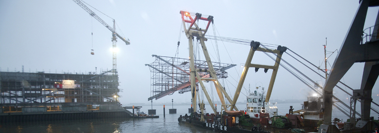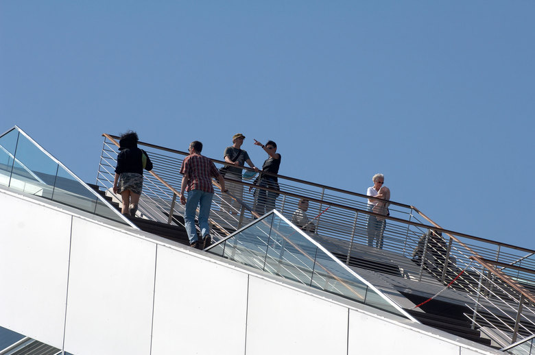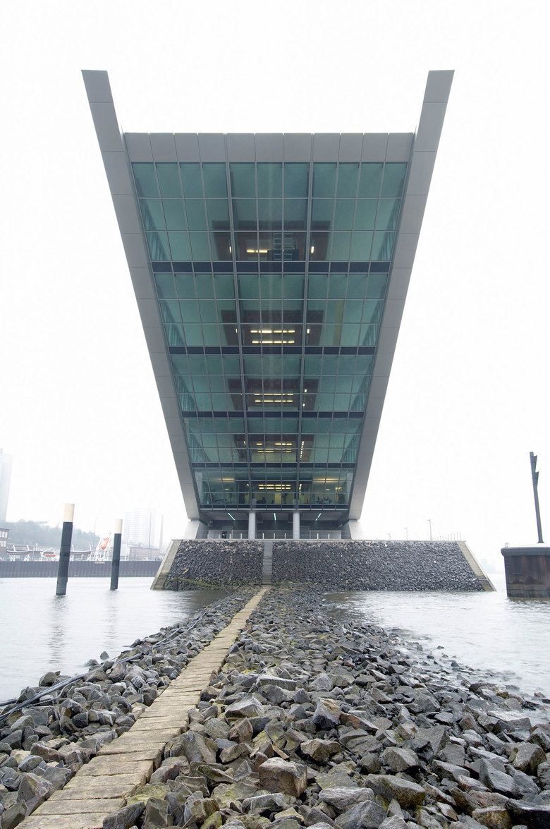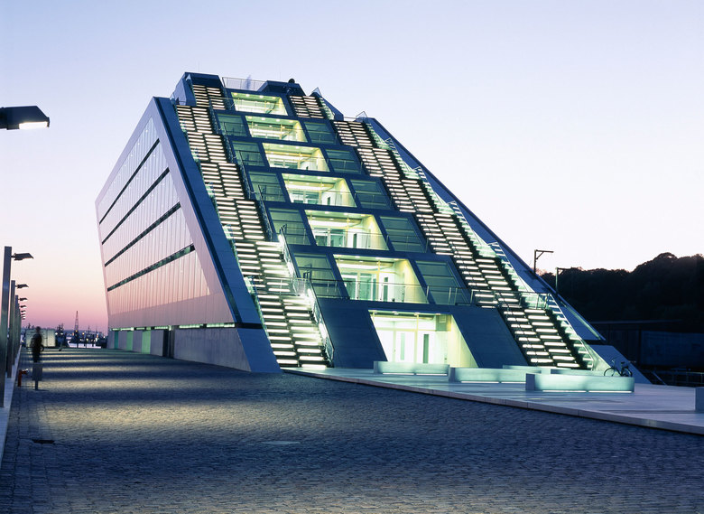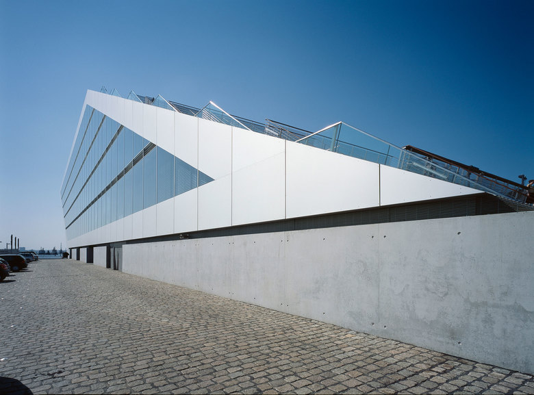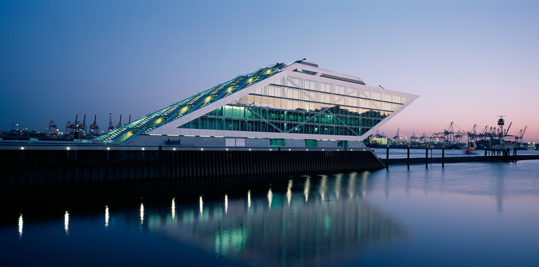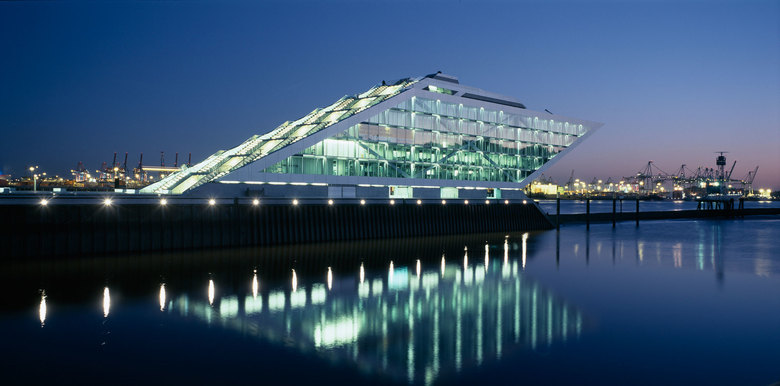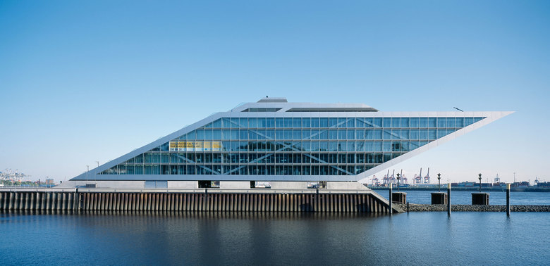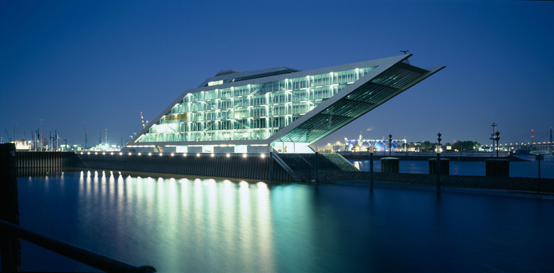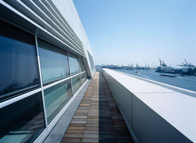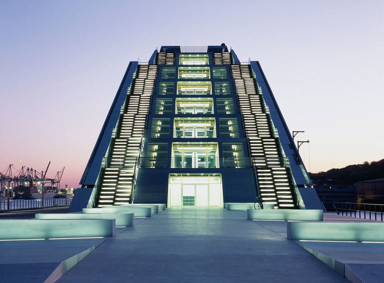 Like a gateway to the city of Hamburg, the Dockland office building stands at one end of Edgar-Engelhard-Kai, a street quay between the Norderelbe, the northern arm of the Elbe River, and the Fischereihafen, the harbour for the fishing trade. The ‘bow’ of this ship-like structure juts out freely over 40 metres to form a dynamic supplement to the ‘stern’ constituted by the neighbouring ferry terminal. The building offers roughly 9000 square metres of office space borne by a steel-frame superstructure. The width of the complex makes it possible to position communication zones such as kitchenettes or conference rooms ‘midships’, though the same applies for archives or spaces for printers. The large open areas containing freely appointed furnishings create a spacious work atmosphere. The glassed-in façade enables employees to enjoy the wonderful view of the port panorama from their offices. Those whose work leaves them no time for pleasurable gazing during the day can make up for it in the evening on the rooftop terrace. Even visitors who aren’t part of the office ‘crew’ can get to the terrace via a public outdoor staircase located at the ‘stern’ of the building.
