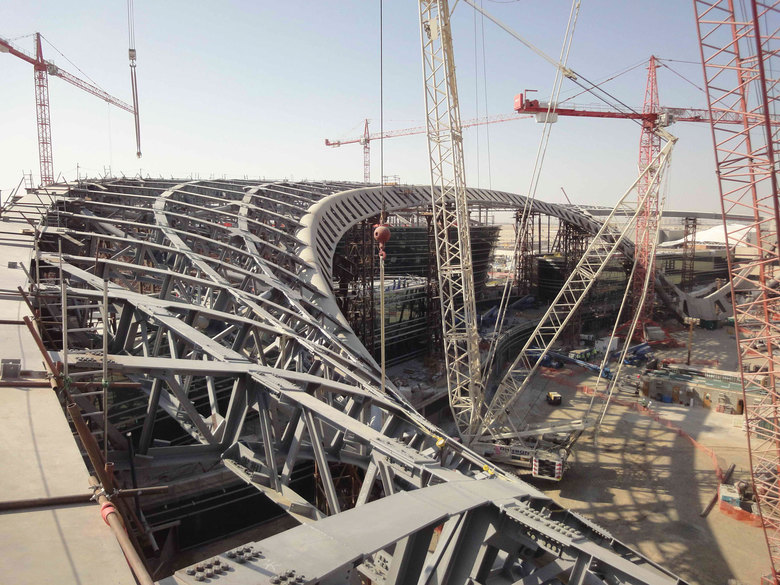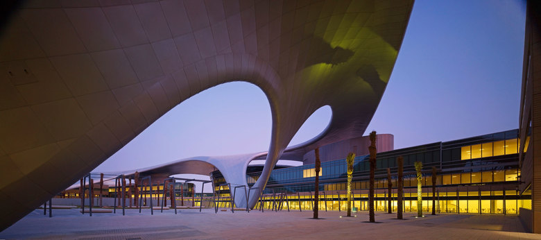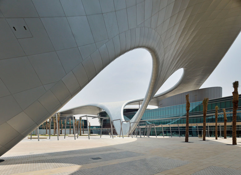 »The new campus sets its emphasis by distinctly marking the focal point. In terms of form, the university’s central functions are organically linked – inspired by the flowing forms of the desert and the veil. In terms of function, the integrated, shade-providing outdoor spaces facilitate communication. In terms of emotion, the academic life in the neighbourhood of other large buildings devoted to culture and sport acquires an image reflecting the standard it has set for itself, one that is distinguishable the world over«