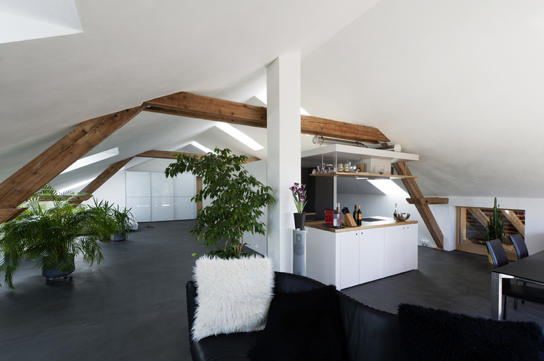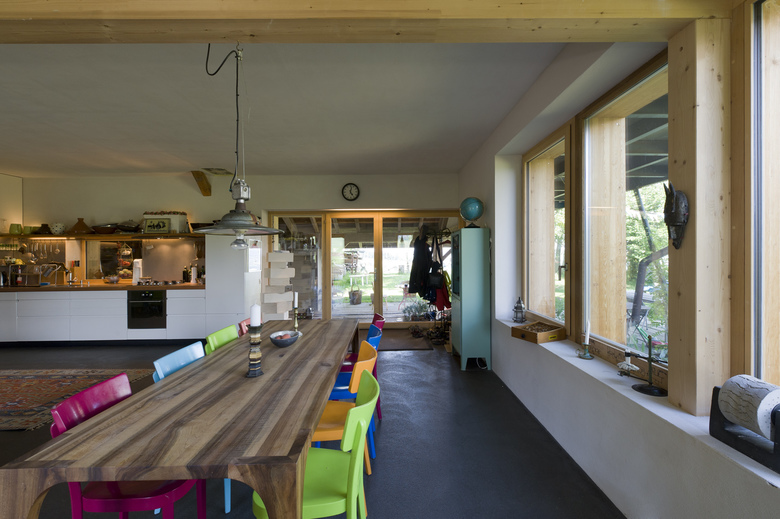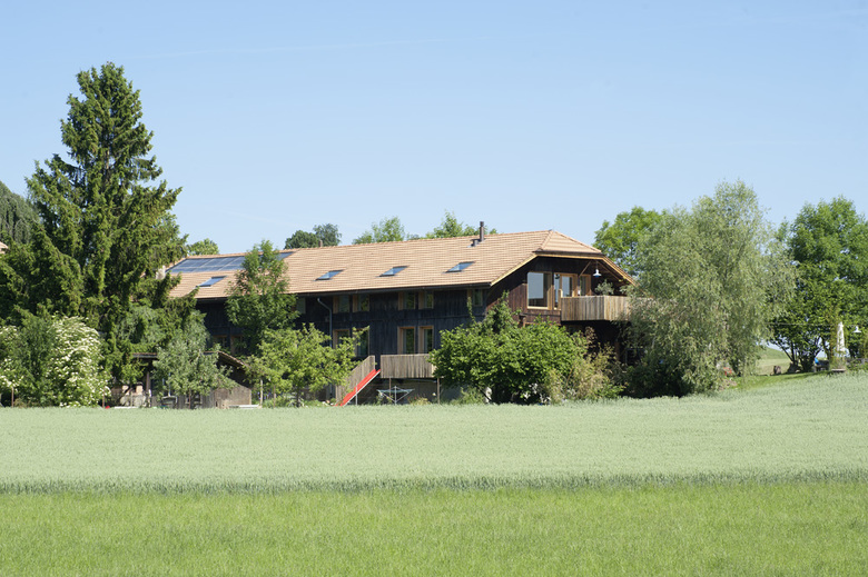 Neu werden im südöstlichen Teil des Gebäudes zwei Geschoss-Wohnungen eingebaut - Einfach, als Haus im Haus, ohne unnötigen Komfort, ein reiner Holzbau, variable offene Grundrisse, gute Tageslichtnutzung, ökologische Materialien, ökonomisch und energieeffizient (Standard Minergie-P). Die bestehende Gebäudehülle wird belassen und bleibt bis auf wenige Ausnahmen unberührt. Weiter ist eine Sonnenkollektoranlage geplant.