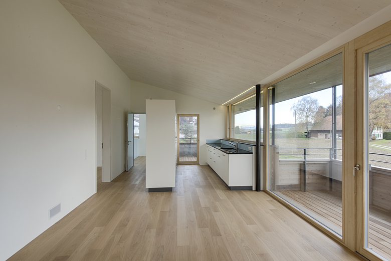 Ausgangssituation: Das bestehende Wohnhaus an der Staatsstrasse war in einem baufälligen Zustand. Die Frage stellte sich ob man es umbauen sollte oder ob das Gebäude einem Ersatzneubau weichen soll. Das bestehende Gebäude wurde als "erhaltenswert" eingestuft. Man entschied sich für einen Ersatzneubau. Die Auflage der Behörden war, dass das neue Gebäude einen landwirtschaftlichen Charakter wiederspiegeln sollte. Das neue Gebäude ist ein zweigeschossiger Holzbau, an welchem der Baustoff Holz zelebriert wird.