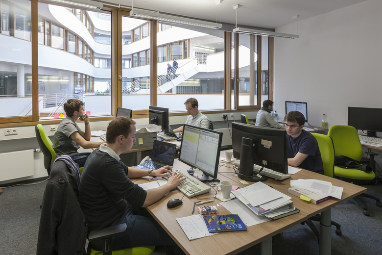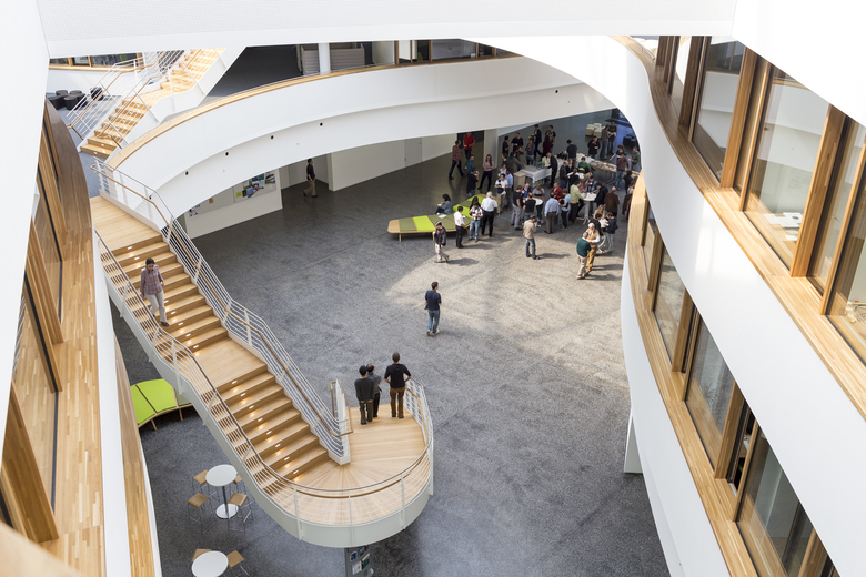 Raum für Kommunikation und interdisziplinären Wissenstransfer – Im CFEL-Neubau sind auf rund 8.500 Quadratmetern hochinstallierte Labore, Büros unterschiedlicher Struktur und Größe sowie Meeting-Zonen und Orte für informelle Kommunikation so angeordnet, dass eine kreativitätsfördernde Arbeitsatmosphäre entsteht. Ein lichtes Foyer verbindet über vier Geschosse die unterschiedlichen Funktionsbereiche miteinander. „Zur Zeit findet ein Paradigmenwechsel hinsichtlich der Kommunikation in Forschungsgebäuden statt“, erläutert Markus Hammes von hammeskrause architekten. „Raum für Kommunikation wird nicht länger als überflüssiger Luxus angesehen, sondern als notwendiger Bestandteil eines nachhaltigen Gebäudekonzepts.“ Im CFEL fördern offene Raumstrukturen die Kommunikation und begünstigen den interdisziplinären Wissenstransfer zwischen den Forschergruppen.
