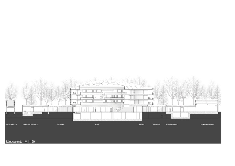 Zwei Elemente bestimmen den Neubau – Auf Grund der speziellen baudynamischen Anforderungen an die schwingungs-entkoppelten physikalischen Messräume werden der Labor- und der Bürobaukörper formal und thematisch unterschiedlich behandelt. Ein massiv verklinkertes Sockelgeschoss bildet die Basis für den runden, dreigeschossigen Bürobaukörper mit einem Durchmesser von rund 57 Metern und einer leichten und transparenten Fassade aus linearen Fensterbändern. Die Lasermessräume für Experimente im Femtosekundenbereich liegen im Erdgeschoss auf rund anderthalb Meter dicken Fundamentplatten um erschütterungsfreie Impulse von einem billiardstel Teil einer Sekunde zu ermöglichen. Im runden Bürobau gruppieren sich in den Obergeschossen Arbeitsräume für die individuelle, konzentrierte Arbeit und gläserne Zellenbüros um offen gestaltete Arbeits- und Besprechungsbereiche.