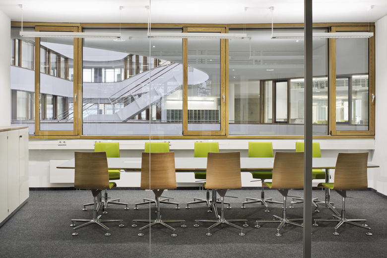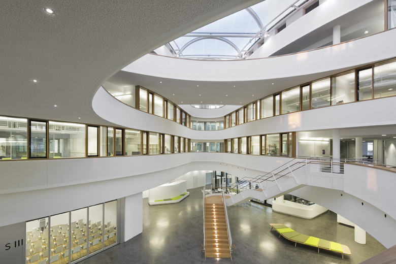 Haushohes Foyer mit Oberlicht aus ETFE-Folienkissen – Um die lichte Eingangshalle und zwei zentrale Gartenhöfe sind drei Seminarräume, 24 Laser-Messräume und eine Cafeteria angeordnet. Das haushohe Foyer im Zentrum des Gebäudes zeichnet sich durch seine besondere Geometrie aus: um ein sphärisches Dreieck rotieren horizontale Büroebenen, die über brückenartige Treppenläufe vertikal verknüpft werden und vielfältige Blickbezüge von einer Ebene zur anderen zulassen. Nach oben öffnet sich das Atrium über ein Oberlicht mit einer filigranen Stahlkonstruktion aus Rundrohrprofilen gefüllt mit mehrlagigen Folienkissen aus Ethylen-Tetraflurethyl (ETFE).