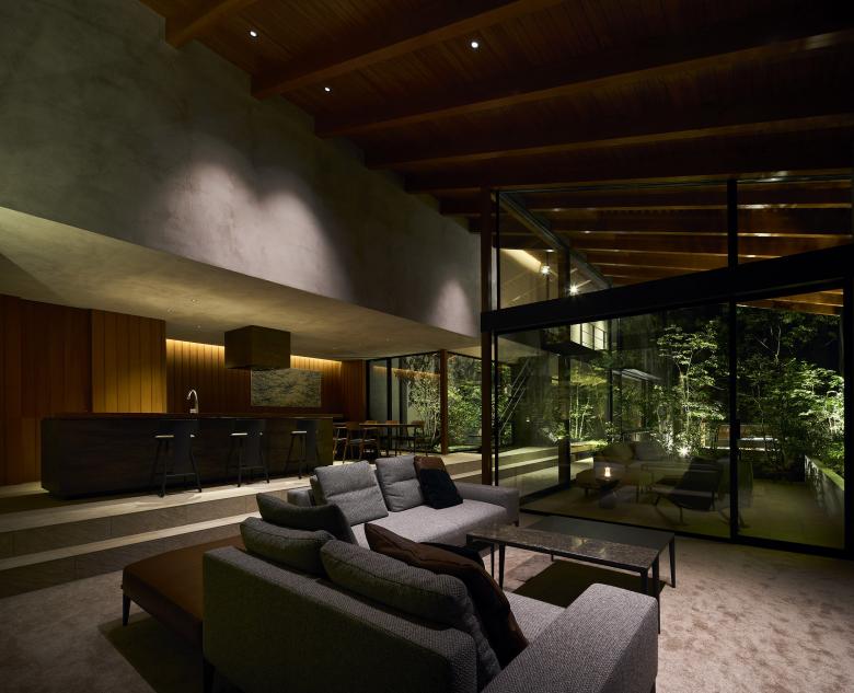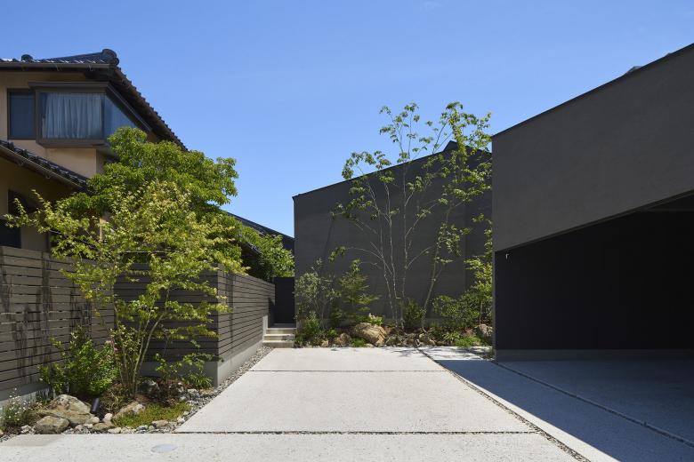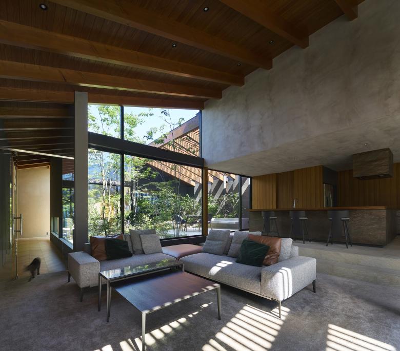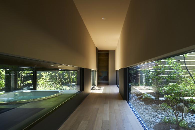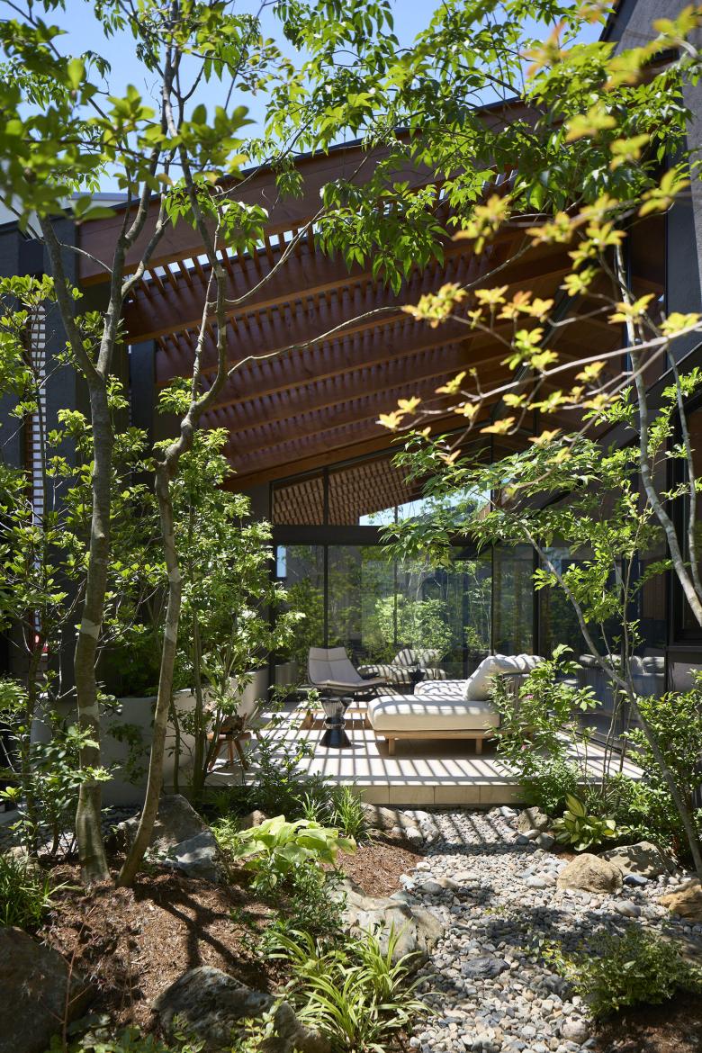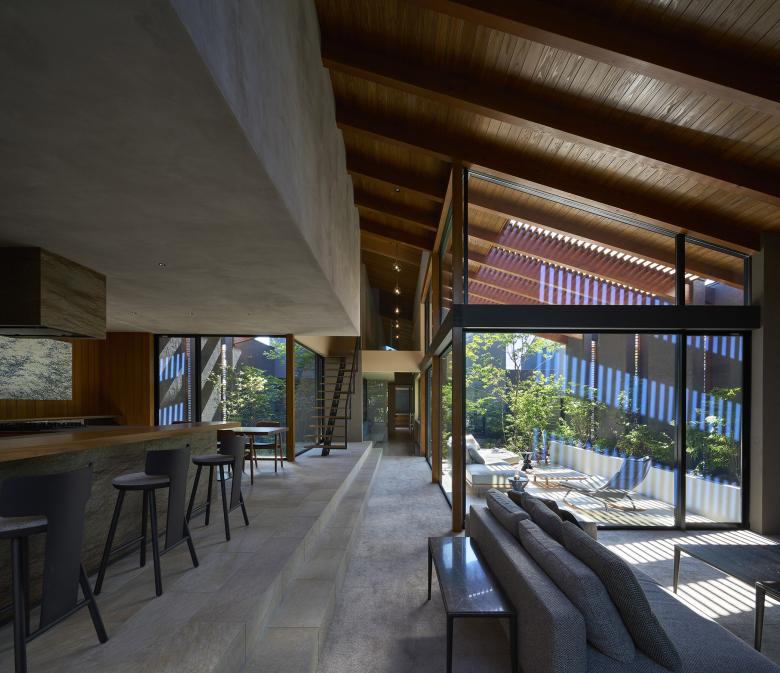 Each of the seven gardens is closely related to adjacent interior spaces and fulfills a distinct role depending on its location. The larger central courtyard and south garden accommodate an outdoor dining area and an outdoor living space, creating a gradational continuity between interior, intermediate, and exterior zones that lends depth to the overall spatial experience. Louvers softly filter views from the surroundings and mitigate direct sunlight, ensuring a comfortable outdoor environment.