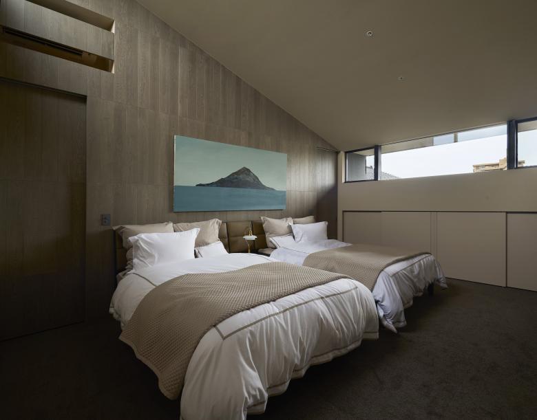 Circulation between rooms was planned with intentionally subdued brightness, creating a contrast with the gardens. The corridor leading from the entrance hall to the living room passes through a dimly lit space illuminated only by low windows, so that the light of the garden ahead is perceived with greater intensity. Similarly, the corridor leading to the study is designed with low windows, aiming for a quiet, cloister-like passage where natural light gently penetrates the darkness.