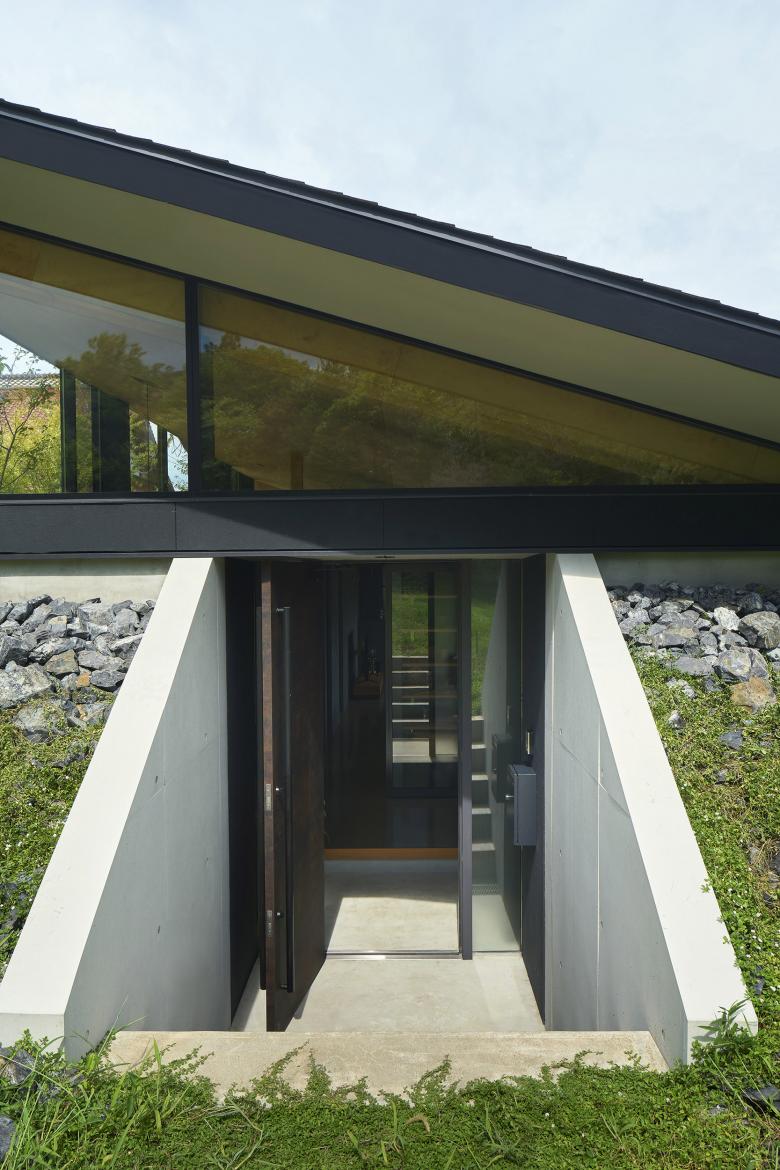 This house was planned in Ōda City, Shimane Prefecture, in a tranquil setting near the Iwami Ginzan Silver Mine, where gentle hills unfold amid a rural landscape. The site is shaped like a small hill, with its crest divided into two levels—an upper and a lower terrace. Rather than leveling this distinctive topography through earthwork, the design embraces the natural undulations of the hill, spanning them with a single, large roof.