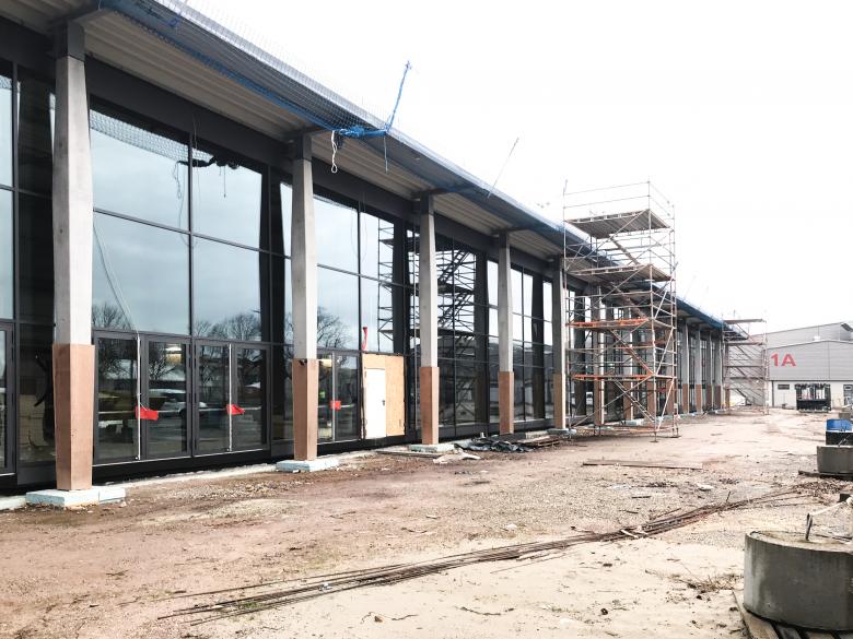 Eine der wichtigsten Modifikationen unseres Entwurfs liegt in der Verbesserung des Übergangs in die Baden-Arena (3). Mit der Verschiebung des Baukörpers um ca. 10m sowie einer leichten Veränderung der Hallenproportionen treffen alle Bestandstüren der Baden-Arena auf das neue Foyer und unter das Vordach. Mit der Verschiebung geht einher, dass die südliche Umfahrung und Andienung deutlich großzügiger wurden.