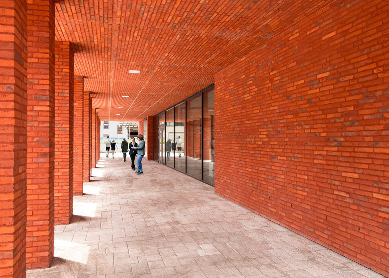 Als Reaktion auf die aktuelle städtebauliche Situation, aber auch um zukünftige städtebauliche Optionen offen zu halten, ist der Neubau von drei Seiten nahezu gleichwertig erschlossen: Einerseits über die östliche Arkade von Nord und Süden und anderseits im Westen durch das durch den Baukörper „gesteckte“ öffentliche Foyer. So findet der besondere öffentliche Charakter des Hauses Ausdruck in der Gestaltung einer offenen Halle, die alle Ebenen über eine elegante Freitreppe großzügig miteinander verbindet. Der Ratssaal liegt der Stadt zugewandt an exponierter Stelle an der nordöstlichen Ecke im 4. OG. Eine eigene, kleine Foyerzone vor seinem Eingang und eine rückwärtige, bedienende Zone ermöglichen einen funktionalen Betrieb. Als besondere Qualität des Saales wird nicht nur ein hoher, zweigeschossiger Raum (Lichte ca 5,80m) angeboten, sondern auch ein hohes, großes Fenster zur Stadt und zum Schlosspark, dem eine repräsentative Stadtloggia vorgelagert ist. Die Räume des Bürgermeisters und seines Stellvertreters sind ebenso wie der Saal direkt an diese Stadtloggia und an das kleine Foyer angebunden. Die Organisation des Grundrisses folgt dem Ziel der Übersichtlichkeit und Funktionalität. Die einzelnen Abteilungen werden zusammenhängend und jeweils mit der Möglichkeit einer ringförmigen Erschließung aufgereiht. Die über alle Geschosse reichende Halle und ihre Freitreppen dient der übersichtlichen Erschließung durch Besucher, zwei notwendige Treppen Räume schaffen auf kurzem Wege die Entfluchtungsmöglichkeit nach draußen. Das „offene“ Haus ist der Idealfall einer einladenden Behörde. Dieser Charakter wird erreicht, indem keine geschossweisen Brandabschnitte gebildet werden, sondern das Haus wird zur Kompensation flächendeckend gesprinklert und mit einer Alarmierung versehen. Diese Lösung ist in Summe wirtschaftlicher als aufwendige Brandabschnittstrennungen und kann durch die Ansonsten sehr wirtschaftliche und kompakte Grundrissorganisation des Hauses ausgeglichen werden.