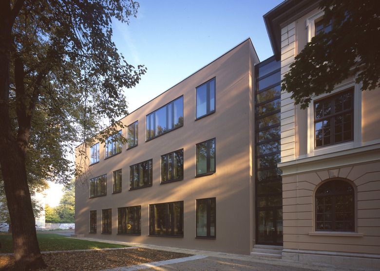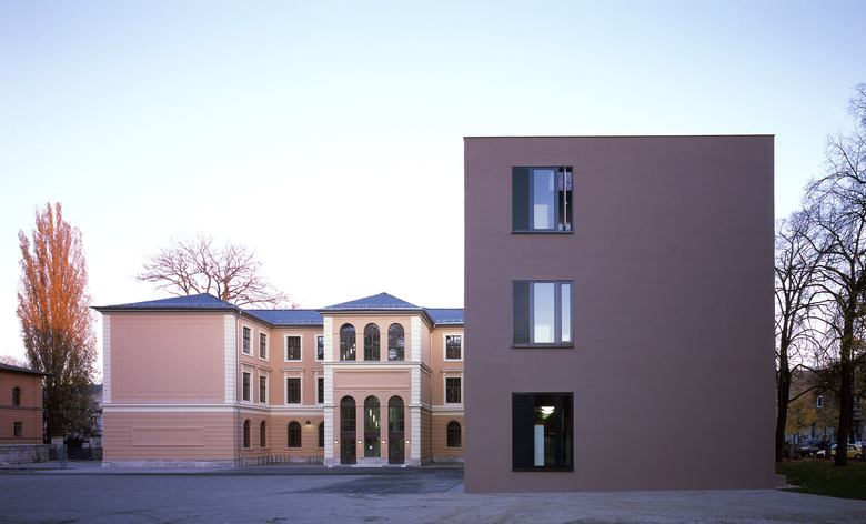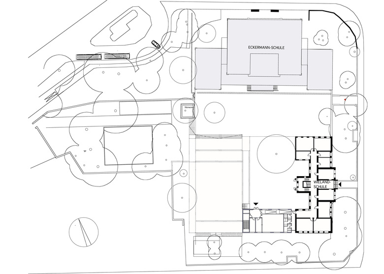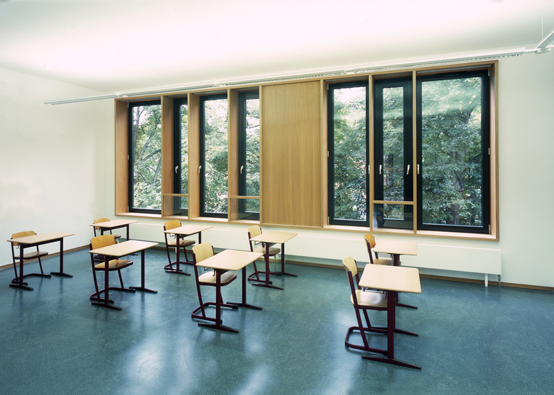 Städtebau – Das Ensemble der beiden Schulen stellt zusammen mit den Freiflächen und dem beachtlichen Baumbestand eine Substanz vonaußergewöhnlicher Qualität dar. Aus diesem Grund wurde als Ergänzung der Schule einen kompakten Baukörper vorgeschlagen, der sich in Volumen, Stellung und Erscheinung zurückhaltend gibt. Alle Neubauten antworten auf die Bestandsgebäude mit zurückhaltender Eleganz. Ruhige, mineralisch eingefärbte Flächen und Fensteröffnungen, die auf Proportion und Gliederung des Altbaus reagieren, bestimmen ihre äußere Erscheinung. Schule und Sporthalle fügen sich wie selbstverständlich ein, sprechen aber eine eigene, zeitgemäße Architektursprache. Das größte Neubauvolumen - die Turnhalle - wird zugunsten des Grundstücks im Gelände versteckt angeordnet. Dennoch ist sie wesentlicher Bestandteil der neuen Gebäudekomposition, da alle Baukörper in ein subtiles geometrisches Beziehungsnetz zueinander gesetzt werden. Es entsteht eine spannungsreiche Zonierung der Freiflächen und eine die Topografie unterstützende Terrassierung des Geländes.