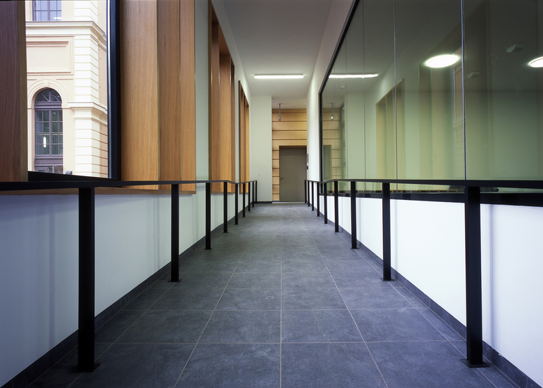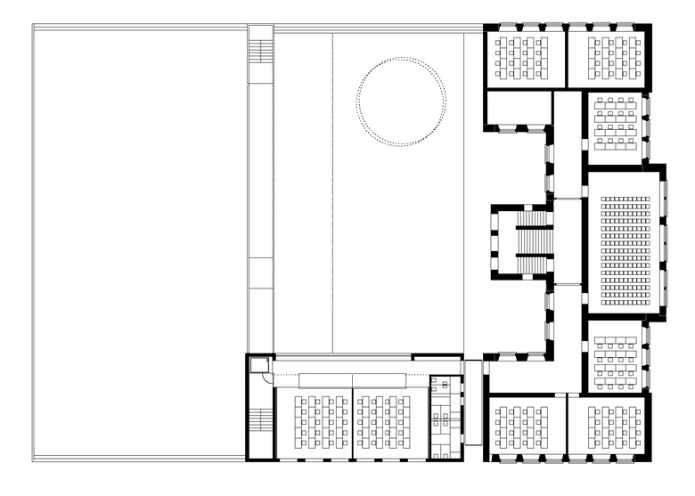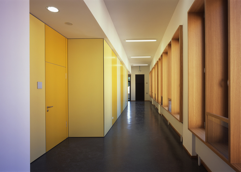 Organisation/Struktur Schule – Das Organisationsprinzip des Erweiterungsbaus ist denkbar einfach gehalten. In Fortsetzung des vorhandenen Flurs werden niveaugleich als direkte Erweiterung jeweils zwei Klassenzimmer und die für ein Geschoss erforderlichen WC-Anlagen angeordnet. Hierdurch ist für die Belegung größtmögliche Flexibilität gegeben. Das am ende des Ergänzungsbaus liegende notwendige Treppenhaus ist ein zusätzlicher baulicher Rettungsweg für den Bestand. Im Erdgeschoss des Neubaus werden - über den Schulhof direkt von außen zugänglich - der Speisesaal und die Turnhalle erschlossen. Neben den WC-Anlagen befinden sich im EG auch zwei kleine Räume (Horterzieher und Bibliothek), die bisher im Altbau lagen, aber wegen der Verlängerung des Flures verlegt werden mussten.