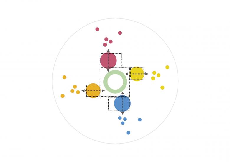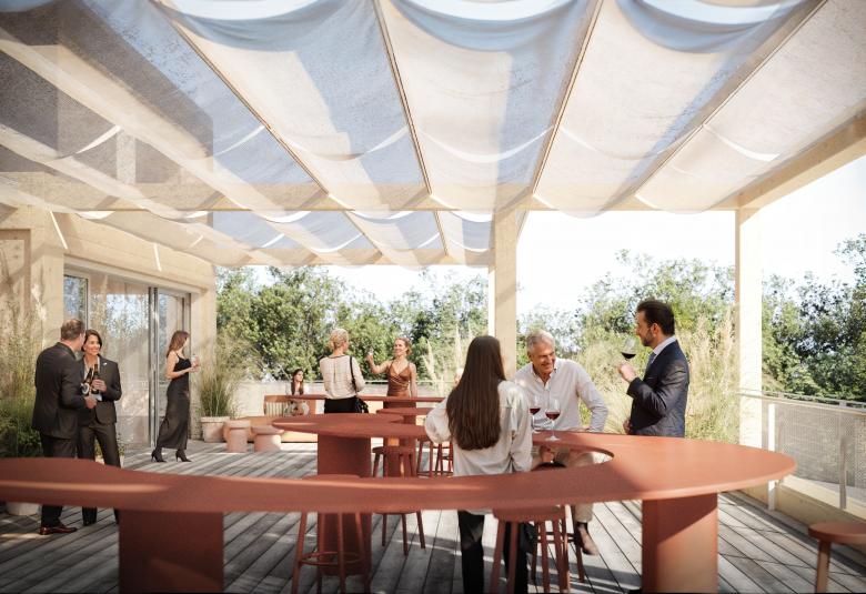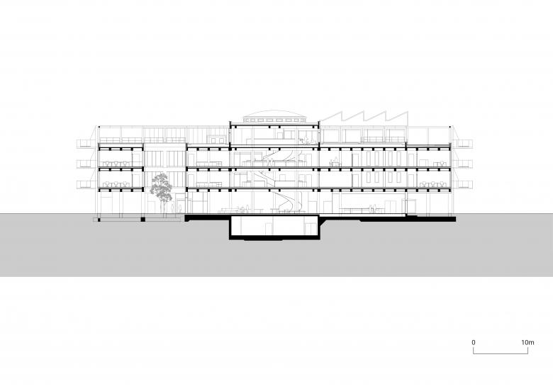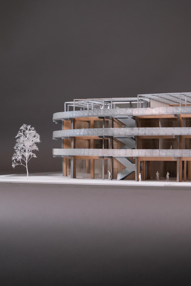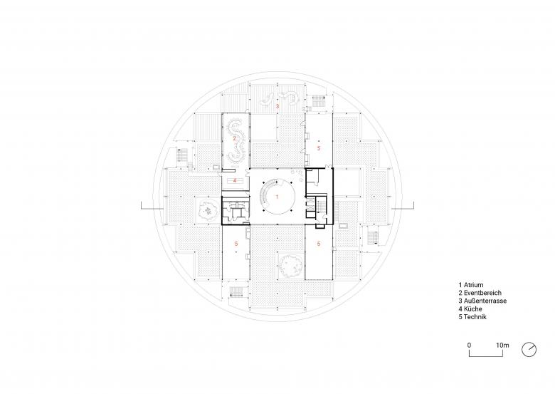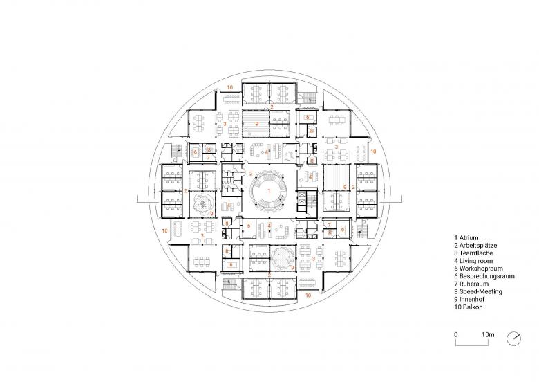 The modular system includes spaces for several smaller companies whose employees can gather in communal areas located around the central atrium for co-working and informal interaction. A generous spiral staircase guides visitors through this communication space, while additional external staircases serve as shortcuts for employees and allow the office units to be accessed independently from the balcony rings. The top floor features rentable event spaces with a rooftop terrace. The Hub’s recessed ground floor establishes a striking north-south axis on the site that links to the lake in the north and to an orchard in the south.