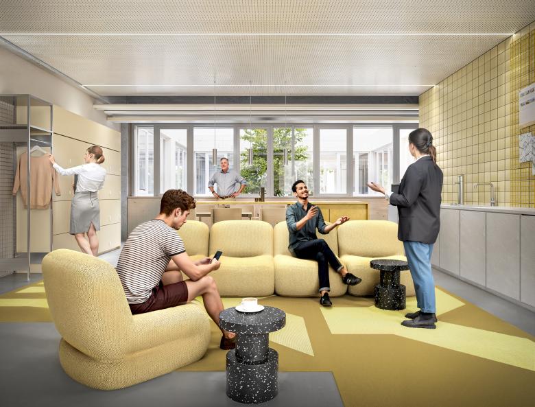 The hub is connected to the low-ex network, a local district heating system that supplies the entire business park. Photovoltaic panels installed on the roof and façade generate energy – any surplus produced is stored in an on-site energy storage system for later use.