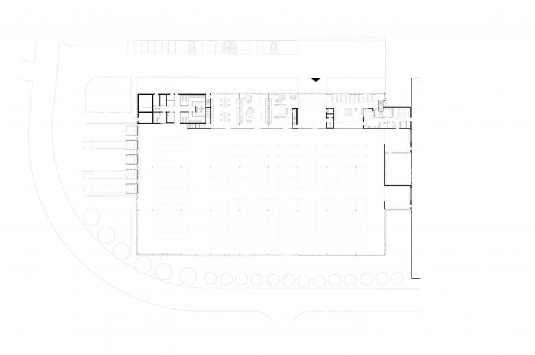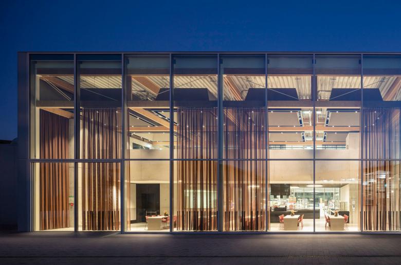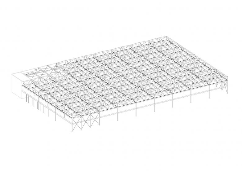 Construction details and the materiality of the furniture have been addressed by the architecture and made widely visible, whereby special attention has been paid to the visible roof support structure, which is a modular arrangement composed of wooden elements that can be easily extended. Even from a distance the structure can be perceived through the transparent façade. It is also characterised by the distinctive recurring intersections of the pincer structure. The efficiency of this construction is reflected in its light and delicate appearance. Square skylight domes provide natural illumination.