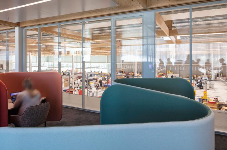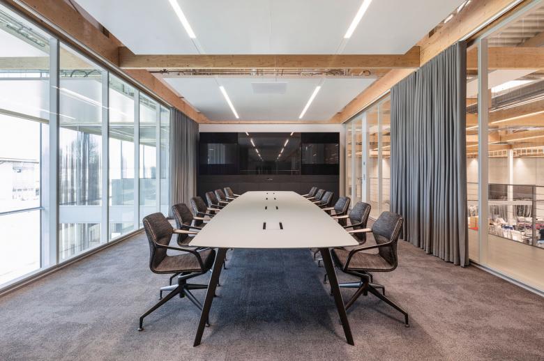 The softly reflecting metal façade with its lightweight structure gives the assembly and consignment areas an industrial appearance. This sophisticated material reflects the green surroundings and complements the warm wood finish of the interior. The Brunner hybrid building serves as a production showcase. The new building opens up the company and allows visitors insights into the manufacturing process.