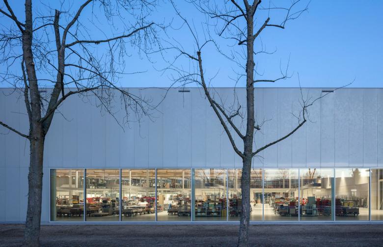 The extension of a production plant of the furniture manufacturer Brunner in Rheinau/Baden integrates production, test and research workshops, offices, as well as a bistro and showrooms in a compact structural form. Final assembly of the furniture is carried out in the two-storey building. The workshop and consignment areas are located in the hall at the rear.