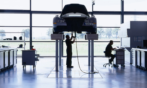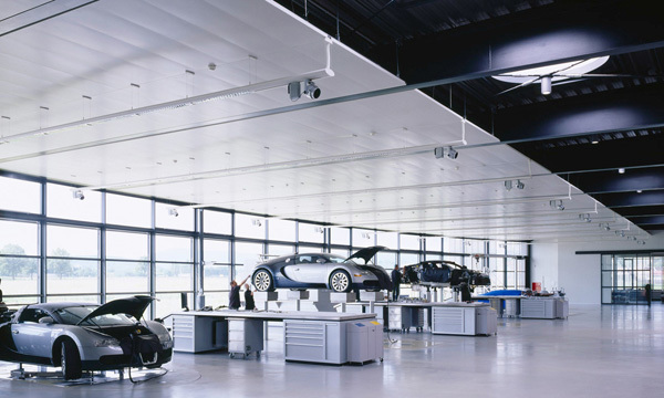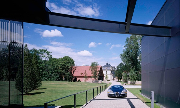 Molsheim is witnessing the renaissance of a legend; the past and the present merge into one - illustrating what Bugatti once was: the pinnacle of the art of automobile engineering. In September 2005, the production plant of the 1001-HP Bugatti Veyron was opened at the famous location. The plant is located to the south of Molsheim in a landscape part with the Chateau St. Jean (1857) at its centre. This consists of an oval studio building and three test modules. The building is positioned on a continuous base, which presents the building as if it were floating. This is where the final construction phase of the Bugatti vehicles takes place. The assembly places are located in the middle of the oval. The front ends are location for, firstly, motor preassembly and, secondly, personnel rooms in the ground floor and offices in the first floor. The test units are to be located across from the assembly places with direct vehicle access. Transparent connections between the modules provide views of the testing process.