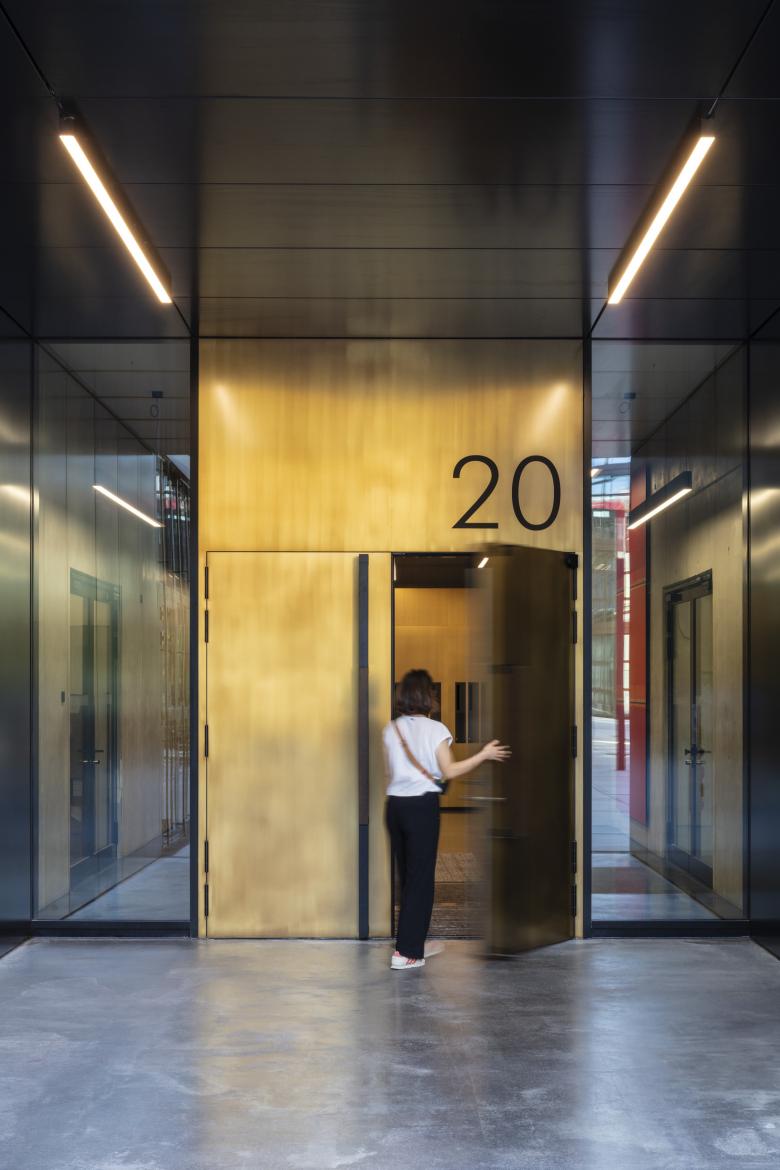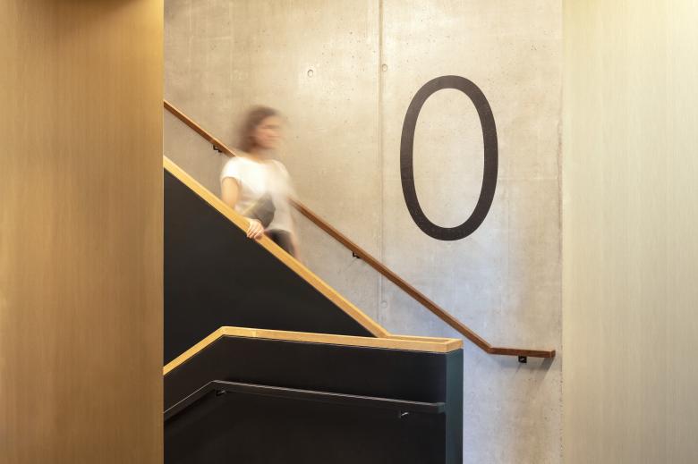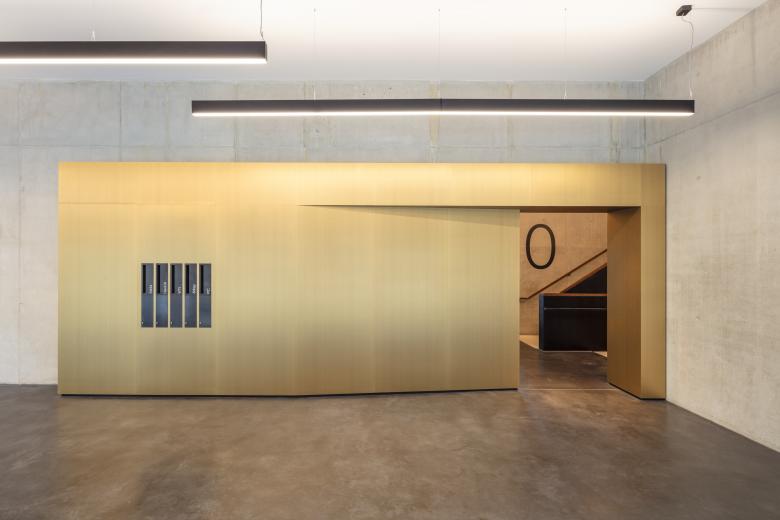 The black color of the façade was developed specifically for this project in a Swiss laboratory. The yellow and golden iron mica it contains lends warmth, friendliness and, depending on the sunlight, a shimmering depth to the buildings. Four main entrances with lobbies facing the campus plaza connect to the interiors, where the rough, untreated concrete of the walls and stairwells contrasts with the warm brass of the mailboxes, which is also visible on doors, elevators and kitchenettes.