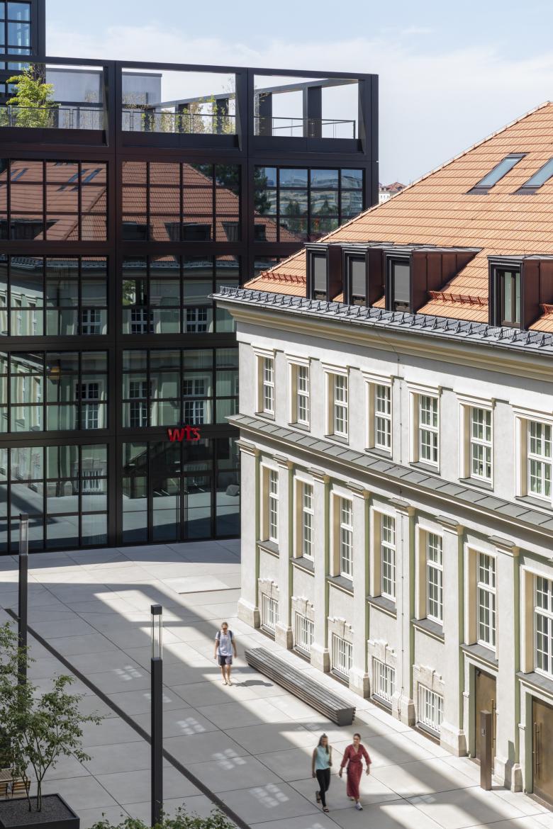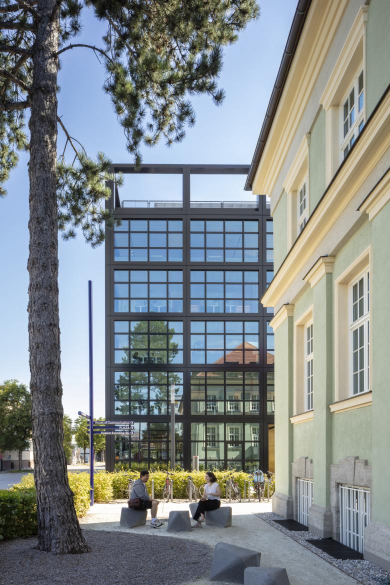 The complex blends harmoniously into its urban context. The small-scale development along Friedenstrasse replicates the scale of the seemingly contradictory neoclassical villa, creating a natural transition to the other iCampus buildings and the entire surrounding Werksviertel neighborhood. Open rooftop pergolas strike a balance between the flat terrain towards the station and the four- to six-story office buildings gradually ascending towards the campus center. The building on Friedenstrasse is set back slightly to create an open villa view and inviting routes into the interior.