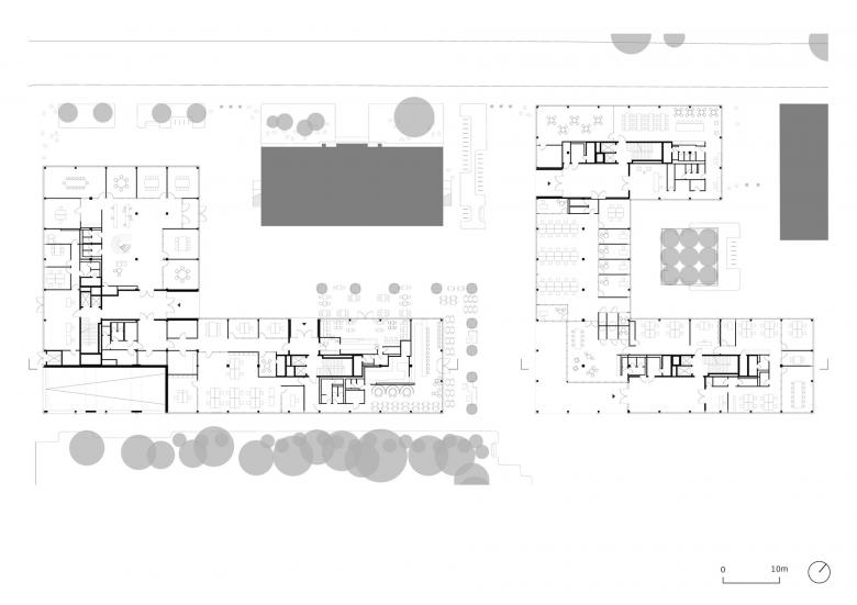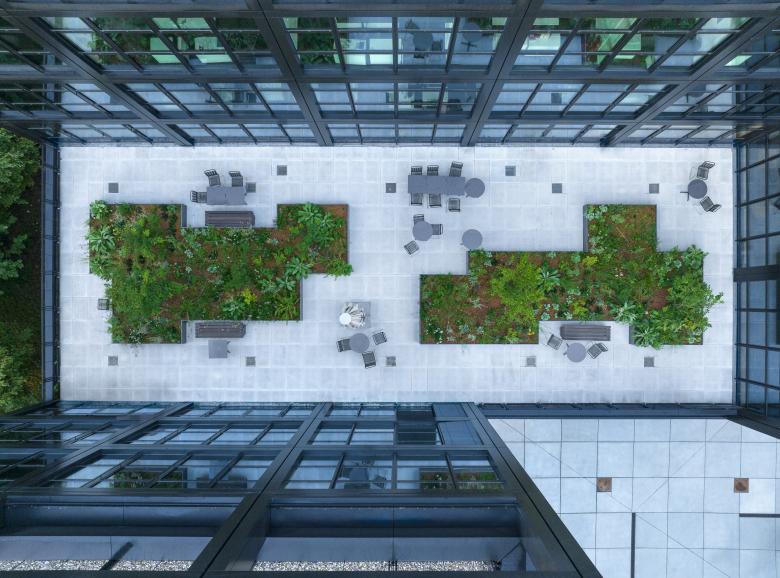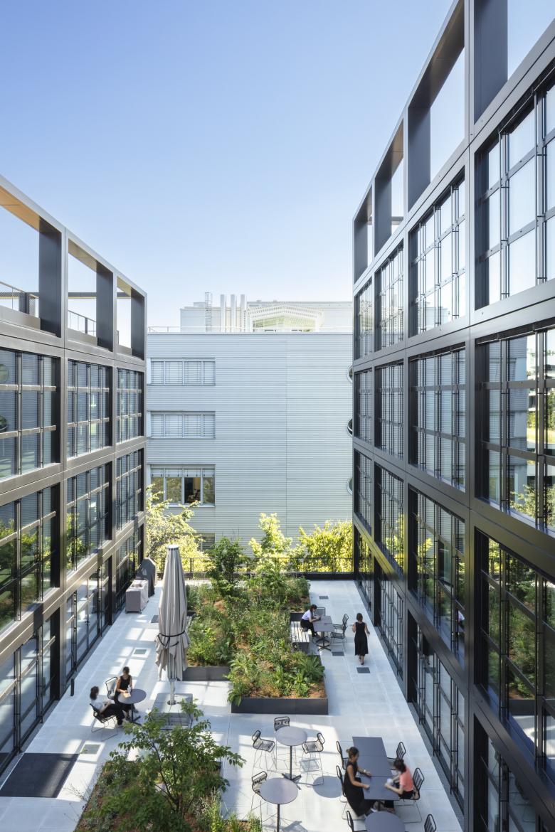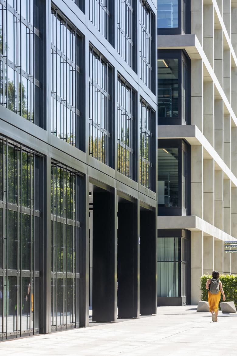 In keeping with the community approach, the design of the campus plaza located in the center of the ensemble resembles an “urban village.” Outdoor seating areas in front of various restaurants and cafés, long wooden benches under trees and green roof terraces create a place where people enjoy working and spending their spare time.